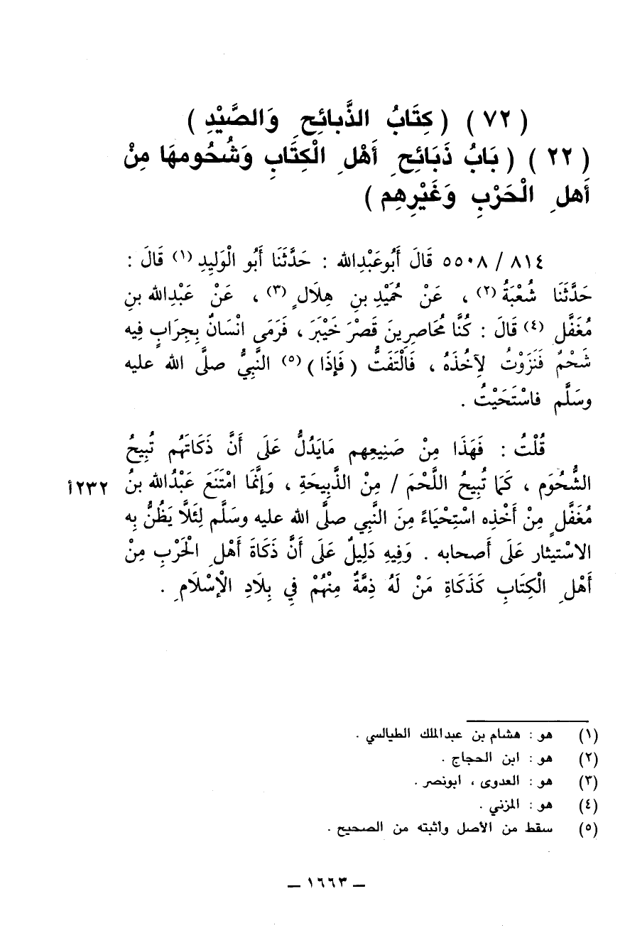 قلت: فهذا من صنعيهم ما يدل على أن ذكاتهم تبيح الشحوم، كما تبيح اللحم / من الذبيحة، وإنما امتنع عبد الله بن مغفل من أخذه استحياء من النبي صلى الله عليه وسلم لئلا يظن به الاستيثار على أصحابه. وفيه دليل على أن ذكاة أهل الحرب من أهل الكتاب كذكاة من له ذمة منهم في بلاد الإسلام.