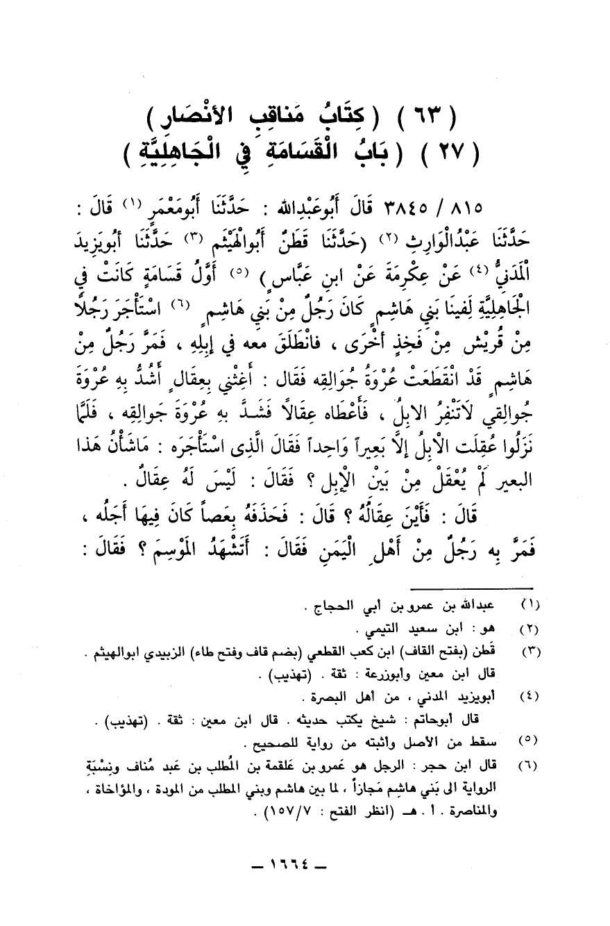 815/ 3845 - قال أبو عبد الله: حدثنا أبو معمر قال: حدثنا عبد الوارث (حدثنا قطن أبو الهيثم حدثنا أبو يزيد المدني عن عكرمة عن ابن عباس) أول قسامة كانت في الجاهلية لفينا بني هاشم كان رجل من بني هاشم استأجر رجلا من فخذ أخرى، فانطلق معه في إبله، فمر رجل من هاشم قد انقطعت عروة جوالقه فقال: أغثني بعقال أشد به عروة جوالقي لا تنفر الابل، فأعطاه عقالا فشد به عروة جوالقه، فلما نزلوا عقلت الابل إلا بعيرا واحدا فقال الذي استأجره: ما شأن هذا البعير لم يعقل من بين الابل؟ فقال: ليس له عقال.