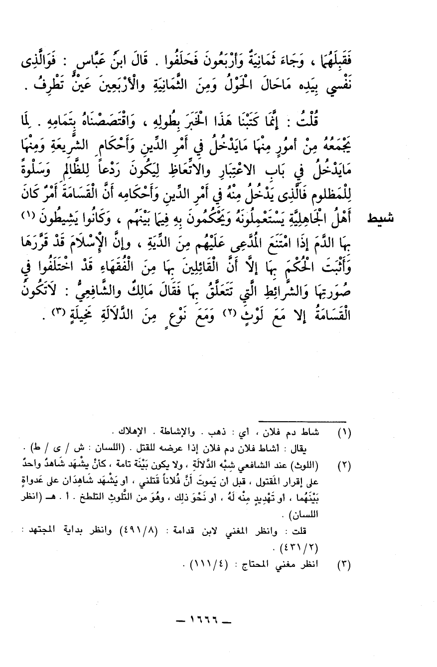 قلت: إنما كتبنا هذا الخبر بطوله، واقتصصناه بتمامه. لما يجمعه من أمور منها ما يدخل في أمر الدين وأحكام الشريعة ومنها ما يدخل في باب الاعتبار والاتعاظ ليكون ردعا للظالم وسلوة للمظلوم فالذي يدخل منه في أمر الدين وأحكامه أن القسامة أمر كان أهل الجاهلية يستعملونه ويحكمون به فيما بينهم، وكانوا يشيطون بها الدم إذا امتنع المدعى عليهم من الدية، وإن الإسلام قد قررها وأثبت الحكم بها إلا أن القائلين بها من الفقهاء قد اختلفوا في صورتها والشرائط التي تتعلق بها فقال مالك والشافعي: لا تكون القسامة إلا مع لوث ومع نوع من الدلالة مخيلة.