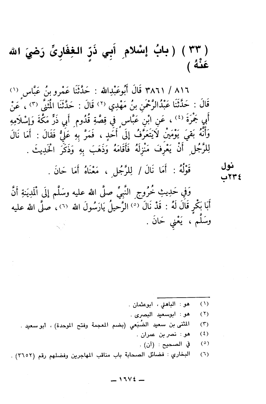 816/ 3861 - قال أبو عبد الله: حدثنا عمرو بن عباس قال: حدثنا المثنى، عن أبي جمرة، عن ابن عباس في قصة قدوم أبي ذر مكة وإسلامه وأنه بقي يومين لا يتعرف إلى أحد، فمر به علي فقال: أما نال للرجل أن يعرف منزله فأقامه وذهب به وذكر الحديث.