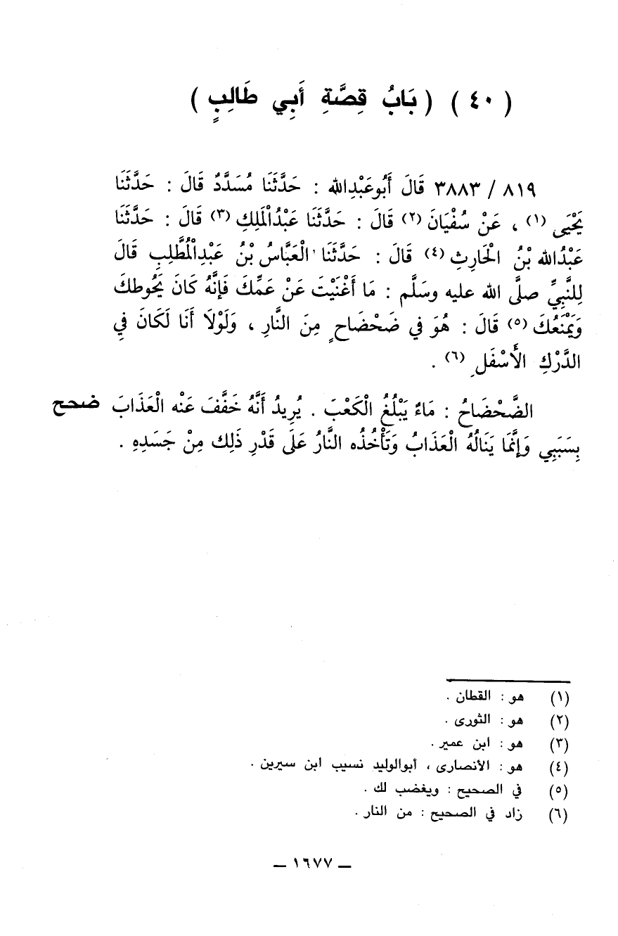 819/ 3883 - قال أبو عبد الله: حدثنا مسدد قال: حدثنا يحيى، عن سفيان قال: حدثنا عبد الملك قال: حدثنا عبد الله بن الحارث قال: حدثنا العباس بن عبد المطلب قال للنبي صلى الله عليه وسلم: ما أغنيت عن عمك فإنه كان يحوطك ويمنعك قال: هو في ضحضاح من النار، ولولا أنا لكان في الدرك الأسفل.