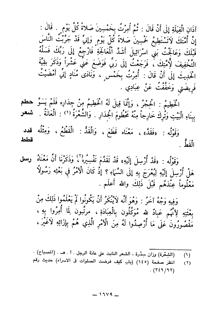الحطيم: الحجر، وإنما قيل له الحطيم من جداره فلم يسو ببناء البيت وترك خارجا منه محطوم الجدار. والشعرة: العانة.