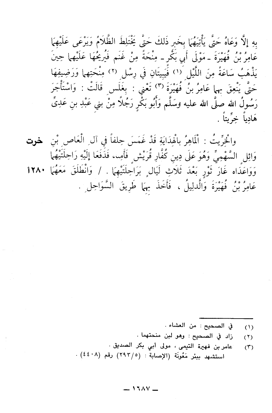 به إلا وعاه حتى يأتيهما بخبر ذلك حتى يختلط الظلام ويرعى عليهما عامر بن فهيرة - مولى أبي بكر - منحه من غنم فيريحها عليهما حين يذهب ساعة من الليل فيبيتان في رسل منحتهما ورضيفها حتى ينعق بهما عامر بن فهيرة تعني: بغلس قالت: واستأجر رسول الله صلى الله عليه وسلم وأبو بكر رجلا من بني عبد بن عدي هاديا خريتا.
