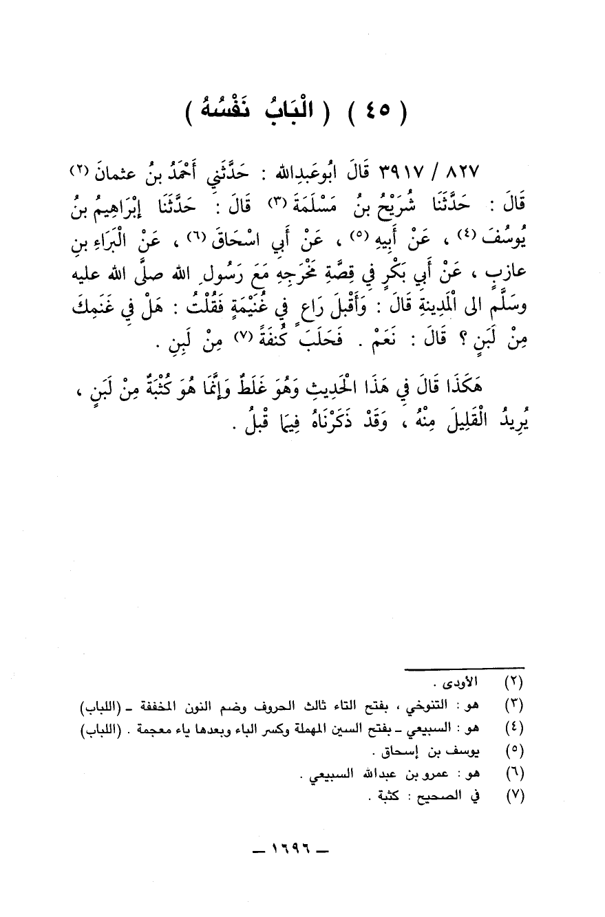 827/ 3917 - قال أبو عبد الله: حدثني أحمد بن عثمان قال: حدثنا شريح بن مسلمة قال: حدثنا إبراهيم بن يوسف، عن أبيه، عن أبي اسحاق، عن البراء بن عازب، عن أبي بكر في قصة مخرجه مع رسول الله صلى الله عليه وسلم إلى المدينة قال: وأقبل راع في غنيمة فقلت: هل لي في غنمك من لبن؟ قال: نعم. فحلب كنفة من لبن.