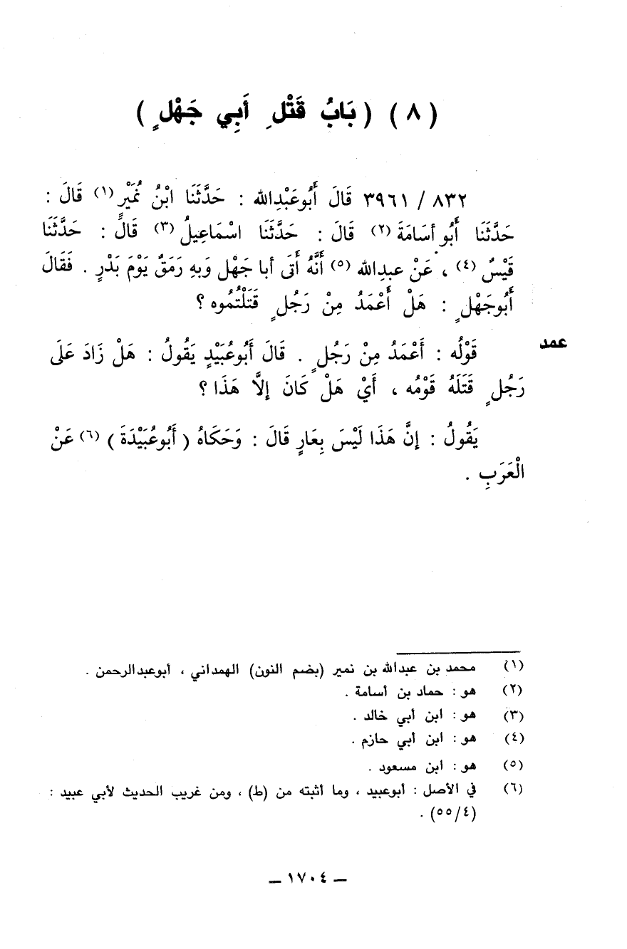 832/ 3961 - قال أبو عبدالله: حدثنا ابن نمير قال: حدثنا أبو أسامة قال: حدثنا اسماعيل قال: حدثنا قيس، عن عبدالله أنه أتى أبا جهل وبه رمق يوم بدر. فقال أبو جهل: هل أعمد من رجل قتلتموه؟