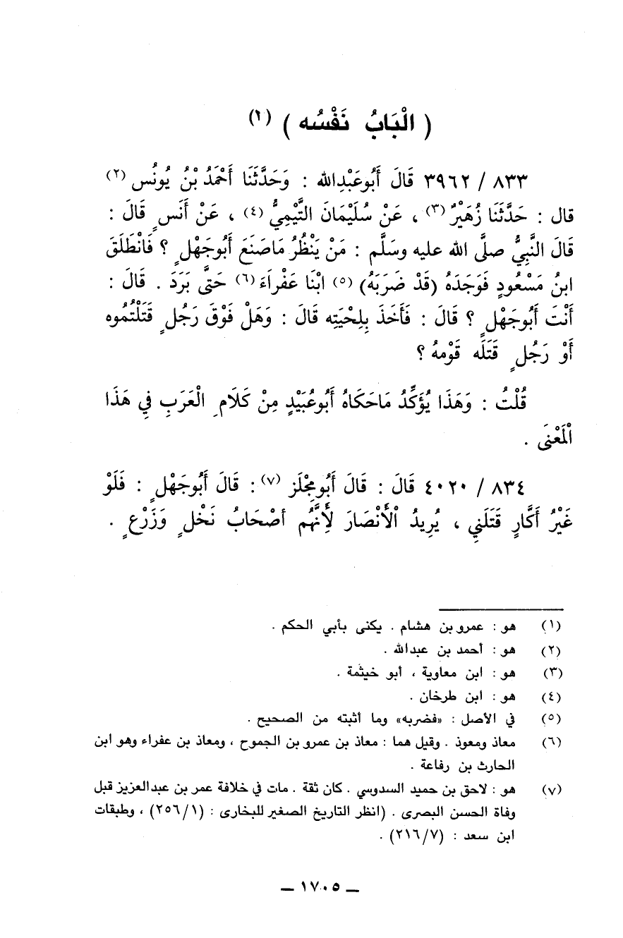 833/ 3962 - قال أبو عبدالله: وحدثنا أحمد بن يونس قال: حدثنا زهير، عن سليمان التيمي، عن أنس قال: قال النبي صلى الله عليه وسلم: من ينظر ماصنع أبو جهل؟ فانطلق ابن مسعود فوجده (قد ضربه) ابنا عفراء حتى برد. قال: أنت أبو جهل؟ قال: فأخذ بلحيته قال: وهل فوق رجل قتلتموه أو رجل قتله قومه؟