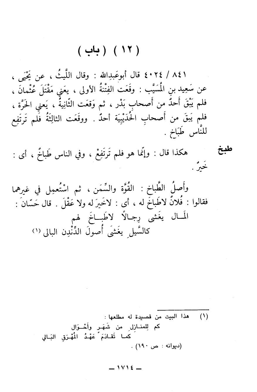841/ 4024 - قال أبو عبدالله: وقال الليث، عن يحيى، عن سعيد بن المسيب: وقعت الفتنة الأولى، يعني مقتل عثمان، فلم يبق أحد من أصحاب بدر، ثم وقعت الثانية، يعني الحرة، فلم يبقى من أصحاب الحديبة أحد، ووقعت الثالثة فلم ترتفع للناس طباخ.