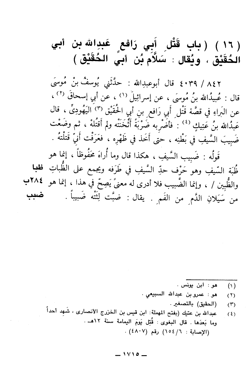 842/ 4039 - قال أبو عبدالله: حدثني يوسف بن موسى قال: حدثني عبيدالله بن موسى، عن إسرائيل، عن ابي اسحاق، عن البراء في قصة قتل أبي رافع بن أبي الحقيق اليهودي، قال عبدالله بن عتيك: فأضربه ضربةً أثخنته ولم أقتله، ثم وضعت ضبيب السيف في بطنه، حتى أخذ في ظهره، فعرفت أني قتلته.