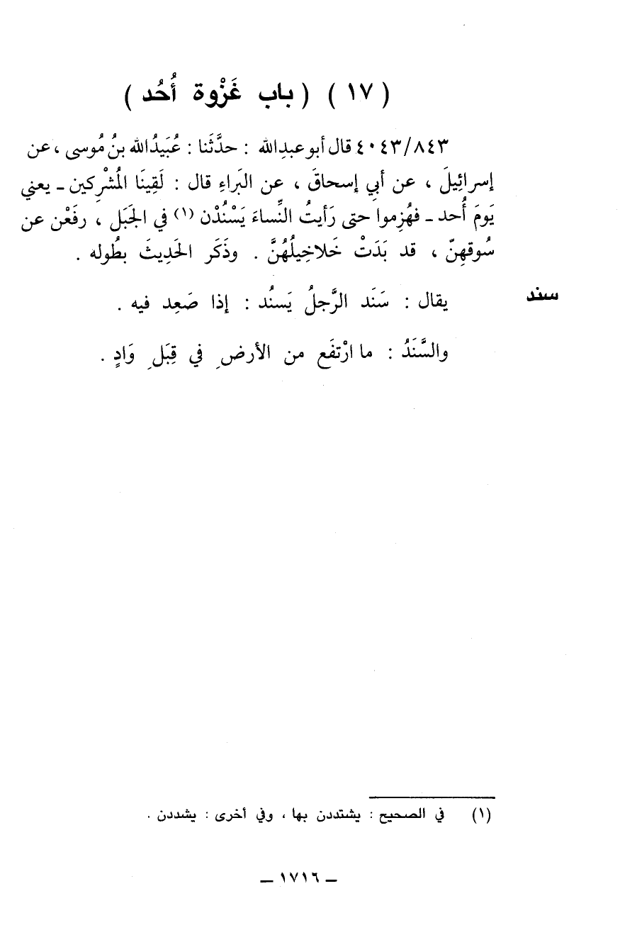 843/ 4043 - قال أبو عبدالله: حدثنا: عبيدالله بن موسى، عن إسرائيل، عن أبي اسحاق، عن البراء قال: لقينا المشركين ــــــ يعني يوم أحد ـــــ فهزموا حتى رأيت النساء يسندن في الجبل، رفعن عن سوقهن، قد بدت خلاخيلهن. وذكر الحديث بطوله.