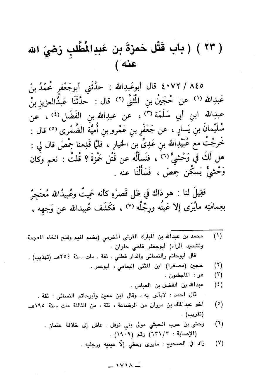 845/ 4072 - قال أبو عبدالله: حدثني أبو جعفر محمد بن عبدالله عن حجين بن المثنى قال: حدثنا عبدالعزيز بن عبدالله ابن أبي سلمة، عن عبدالله بن الفضل، عن سليمان بن يسار، عن جعفر بن عمرو بن أمية الضمري قال: خرجت مع عبيد الله بن عدي بن الخيار، فلما قدمنا حمص قال لي: هل لك في وحشي فنسأله عن قتل حمزة؟ قلت: نعم وكان وحشي يسكن حمص، فسألنا عنه.