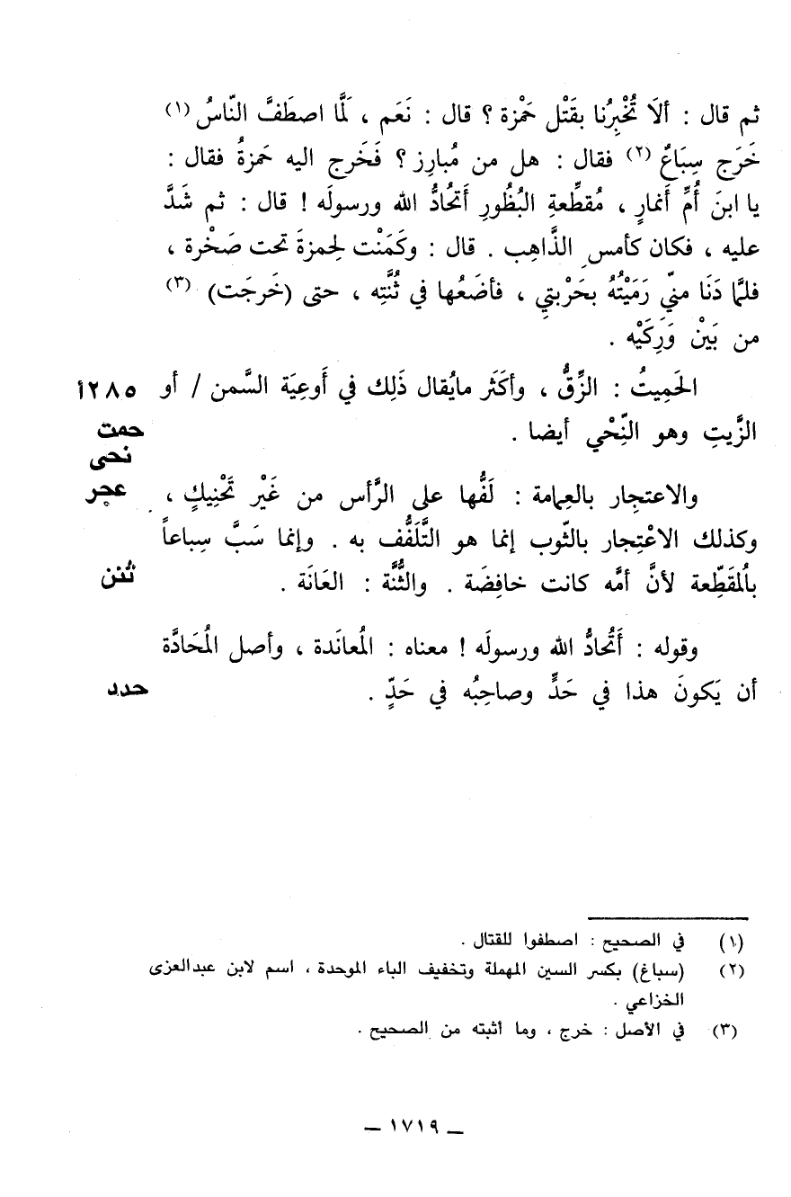 ثم قال: ألا تخبرنا بقتل حمزة؟ قال: نعم، لما أصطف الناس خرج سباع فقال: هل من مبارز؟ فخرج اليه حمزة فقال: يا ابن أم أنمار، مقطعة البظور أتحاد الله ورسوله! قال: ثم شد عليه، فكان: كأمس الذاهب. قال: وكمنت لحمزة تحت صخرة، فلما دنا مني رميته بحربتي، فأضعها في ثنيته، حتى (خرجت) من بين وركيه.