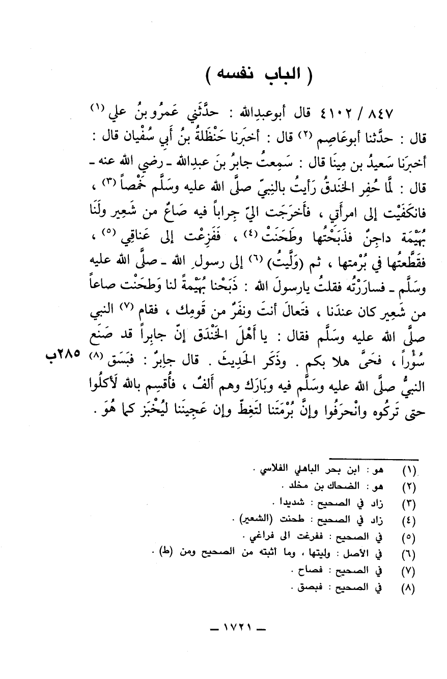 847/ 4102 - قال أبو عبدالله: حدثني عمرو بن علي قال: حدثنا أبو عاصم قال: أخبرنا حنظلة بن أبي سفيان قال: أخبرنا سعيد بن مينا قال: سمعت جابر بن عبدالله - رضي الله عنه - قال: لما حفر الخندق رأيت النبي صلى الله عليه وسلم خمصاً، فانكفيت إلى امرأتي، فأخرجت الى جرابا فيه صاع من شعير ولنا بهيمة داجن فذبحتها وطحنت، ففزعت إلى عناقي ـ فقطعتها في برمتها، ثم (وليت) إلى رسول الله صلى الله عليه وسلم - فساررته فقلت يا رسول الله: ذبحنا بهيمة لنا وطحنت صاعا من شعير كان عندنا، فتعال أنت ونفر من قومك، فقام النبي صلى الله عليه وسلم فقال: يا أهل الخندق إن جابراً قد صنع سوراً، فحى هلا بكم. وذكر الحديث. قال جابر: فبسق النبي صلى الله عليه وسلم فيه وبارك وهم ألف، فأقسم بالله لأكلوا حتى تركوه وانحرفوا وإن برمتنا لتغط وإن عجيننا ليخبز كما هو.