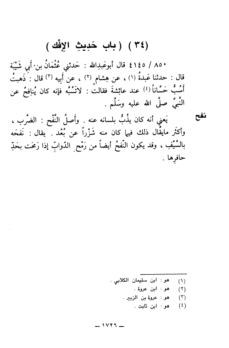 850/ 4145 - قال أبو عبدالله: حدثني عثمان بن أبي شيبة قال: حدثنا عبدة، عن هشام، عن أبيه قال: ذهبت أسب حساناً عند عائشة فقالت: لا تسبه فإنه كان ينافح عن النبي صلى الله عليه وسلم.
