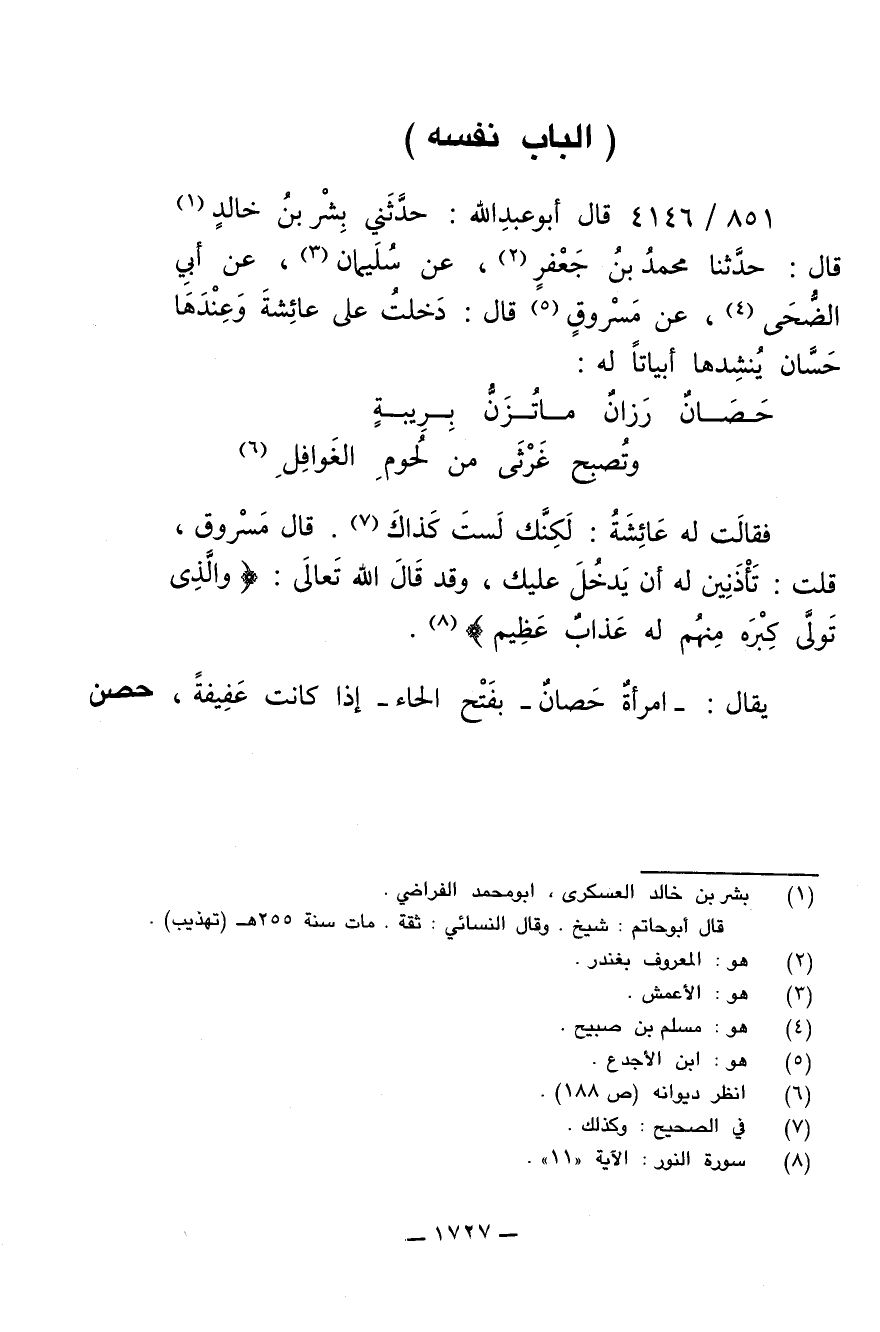 851/ 4146 - قال أبو عبدالله: حدثني بشر بن خالد قال: حدثنا محمد بن جعفر، عن سليمان، عن أبي الضحى، عن مسروق قال: دخلت على عائشة وعندها حسان ينشدها أبياتاً له: