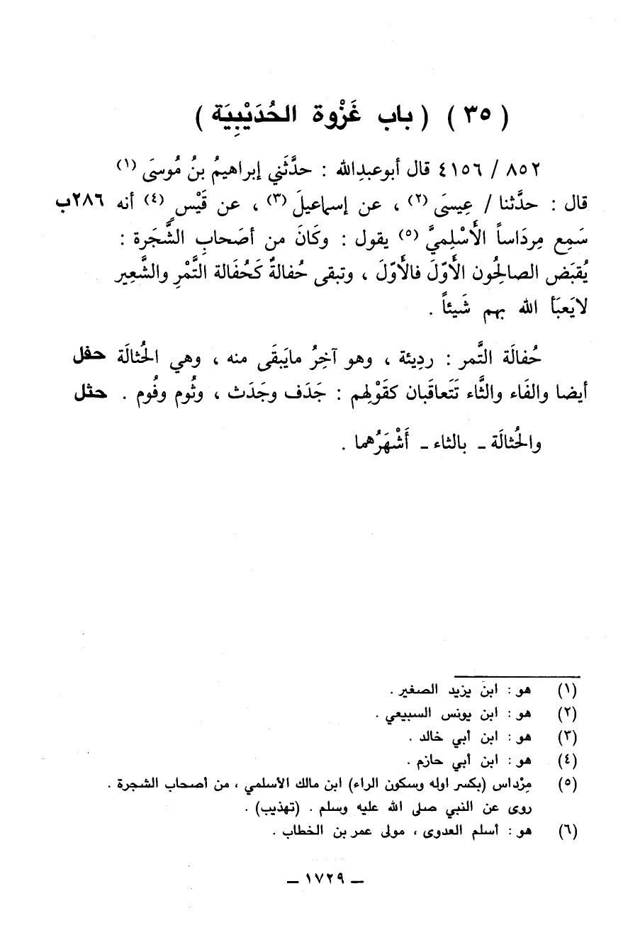 852/ 4156 - قال أبو عبدالله: حدثني إبراهيم بن موسى قال: حدثنا / عيسى، عن إسماعيل، عن قيس أنه سمع مرداساً الأسلمي يقول: وكان من أصحاب الشجرة: يقبض الصالحون الأول فالأول، وتبقى حفالة كحفالة التمر والشعير لا يعبأ الله بهم شيئاً.