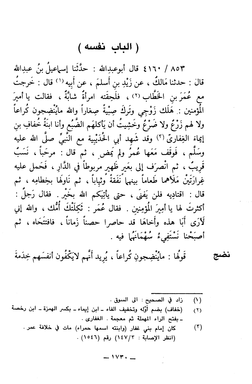 853/ 4160 - قال أبو عبدالله: حَدَّثَنَا إِسْمَاعِيلُ بْنُ عَبْدِ اللَّهِ قَالَ: حَدَّثَنا مَالِكٌ عَنْ زَيْدِ بْنِ أَسْلَمَ عَنْ أَبِيهِ قَالَ: خَرَجْتُ مَعَ عُمَرَ بْنِ الْخَطَّابِ - رضى الله عنه -، فَلَحِقَتْه امْرَأَةٌ شَابَّةٌ فَقَالَتْ يَا أَمِيرَ الْمُؤْمِنِينَ: هَلَكَ زَوْجِي وَتَرَكَ صِبْيَةً صِغَاراً، وَاللَّهِ مَا يُنْضِجُونَ كُرَاعاً، وَلاَ لَهُمْ زَرْعٌ وَلاَ ضَرْعٌ، وَخَشِيتُ أَنْ تَاكُلَهُمُ الضَّبُعُ، وَأَنَا ابنةُ خُفَافِ بْنِ إِيْمَاءَ الْغِفَارِىِّ، وَقَدْ شَهِدَ أَبِي الْحُدَيْبِيَةَ مَعَ النَّبِيِّ صلى الله عليه وسلم، فَوَقَفَ مَعَهَا عُمَرُ، وَلَمْ يَمْضِ، ثُمَّ قَالَ مَرْحَباً نَسَبٍ قَرِيبٍ. ثُمَّ انْصَرَفَ إِلَى بَعِيرٍ ظَهِيرٍ مَرْبُوطاً فِي الدَّارِ، فَحَمَلَ عَلَيْهِ غِرَارَتَيْنِ مَلأَهُمَا طَعَاماً، بَيْنَهُمَا نَفَقَةً وَثِيَاباً، ثُمَّ نَاوَلَهَا بِخِطَامِهِ ثُمَّ قَالَ: اقْتَادِيهِ فَلَنْ يَفْنَى حَتَّى يَاتِيَكُمُ اللَّهُ بِخَيْرٍ. فَقَالَ رَجُلٌ: أَكْثَرْتَ لَهَا يَا أَمِيرَ الْمُؤْمِنِينَ. فَقَالَ عُمَرُ: ثَكِلَتْكَ أُمُّكَ، وَاللَّهِ إِنِّي لأَرَى أَبَا هَذِهِ وَأَخَاهَا قَدْ حَاصَرَا حِصْناً زَمَاناً، فَافْتَتَحَاهُ، ثُمَّ أَصْبَحْنَا نَسْتَفِيءُ سُهْمَانَهُمَا فِيهِ.