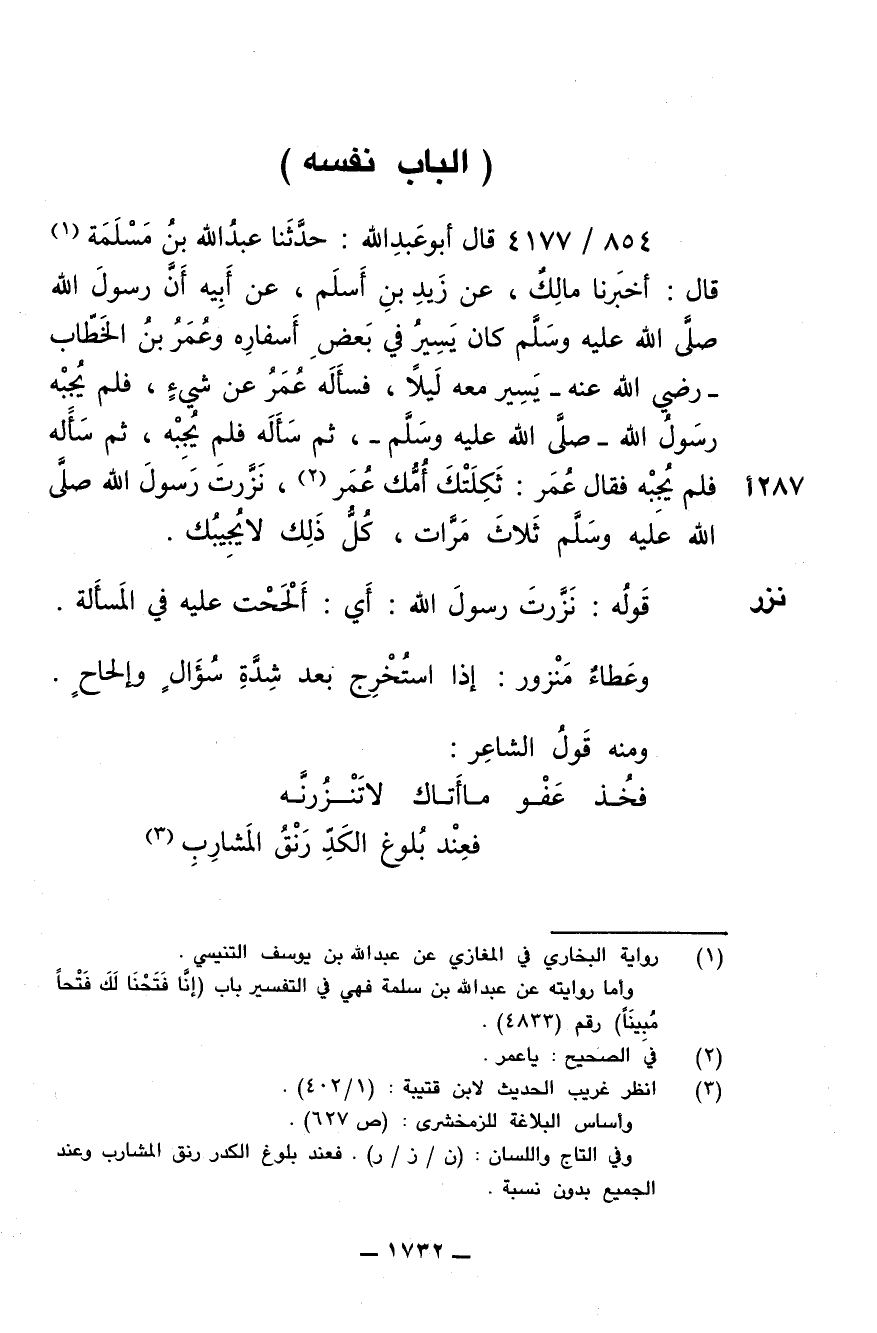 854/ 4177 - قال أبو عبدالله: حَدَّثَنا عَبْدُ اللَّهِ بْنُ مسلمة قال: أَخْبَرَنَا مَالِكٌ عَنْ زَيْدِ بْنِ أَسْلَمَ عَنْ أَبِيهِ أَنَّ رَسُولَ اللَّهِ صلى الله عليه وسلم: كَانَ يَسِيرُ فِي بَعْضِ أَسْفَارِهِ، وَعُمَرُ بْنُ الْخَطَّابِ - رضى الله عنه - يَسِيرُ مَعَهُ لَيْلاً، فَسَأَلَهُ عُمَرُ عَنْ شَيءٍ فَلَمْ يُجِبْهُ رَسُولُ اللَّهِ صلى الله عليه وسلم ثُمَّ سَأَلَهُ فَلَمْ يُجِبْهُ، ثُمَّ سَأَلَهُ فَلَمْ يُجِبْهُ فَقَالَ عُمَرُ ثَكِلَتْكَ أُمُّكَ عُمَرُ، نَزَرْتَ رَسُولَ اللَّهِ صلى الله عليه وسلم ثَلاَثَ مَرَّاتٍ، كُلُّ ذَلِكَ لاَ يُجِيبُكَ.