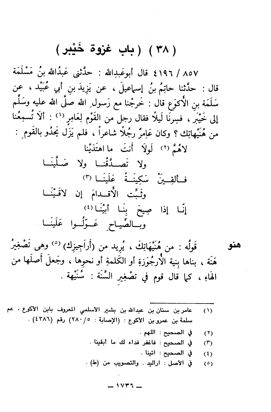 857/ 4196 - قال أبو عبدالله: حَدَّثَني عَبْدُ اللَّهِ بْنُ مَسْلَمَةَ قال: حَدَّثَنَا حَاتِمُ بْنُ إِسْمَاعِيلَ عَنْ يَزِيدَ بْنِ أَبِى عُبَيْدٍ عَنْ سَلَمَةَ بْنِ الأَكْوَعِ - رضى الله عنه - قَالَ: خَرَجْنَا مَعَ رسول الله صلى الله عليه وسلم إِلَى خَيْبَرَ فَسِرْنَا لَيْلاً، فَقَالَ رَجُلٌ مِنَ الْقَوْمِ لِعَامِرٍ: أَلاَ تُسْمِعُنَا مِنْ هُنَيْهَاتِكَ؟ وَكَانَ عَامِرٌ رَجُلاً شَاعِراً فَلم يَزَل يَحْدُو بِالْقَوْمِ: