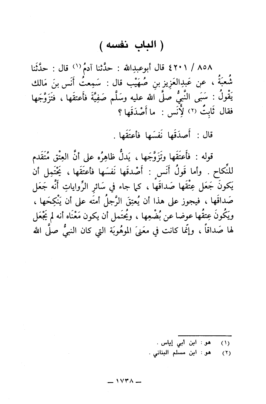 858/ 4201 - قال أبو عبدالله: حَدَّثَنَا آدَمُ قال: حَدَّثَنَا شُعْبَةُ عَنْ عَبْدِ الْعَزِيزِ بْنِ صُهَيْبٍ قَالَ: سَمِعْتُ أَنَسَ بْنَ مَالِكٍ - رضى الله عنه - يَقُولُ: سَبَى النَّبِيُّ صلى الله عليه وسلم صَفِيَّةَ، فَأَعْتَقَهَا فَتَزَوَّجَهَا. فَقَالَ ثَابِتٌ لأَنَسٍ: مَا أَصْدَقَهَا؟ قَالَ: أَصْدَقَهَا نَفْسَهَا فَأَعْتَقَهَا.