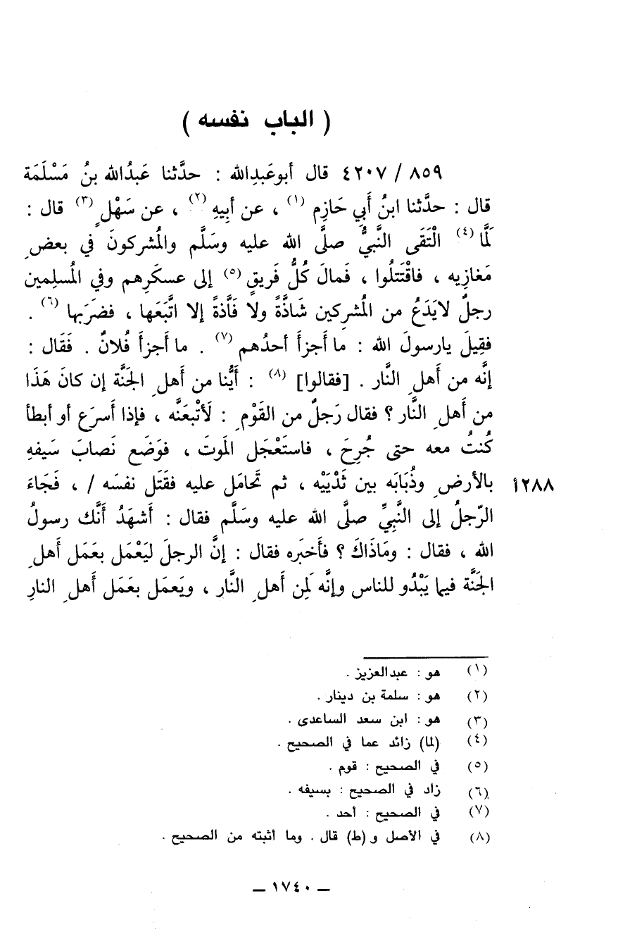 859/ 4207 - قال أبو عبدالله: حَدَّثَنَا عَبْدُ اللَّهِ بْنُ مَسْلَمَةَ قال: حَدَّثَنَا ابْنُ أَبِي حَازِمٍ عَنْ أَبِيهِ عَنْ سَهْلٍ قَالَ: لما الْتَقَى النَّبِيُّ صلى الله عليه وسلم وَالْمُشْرِكُونَ فِي بَعْضِ مَغَازِيهِ فَاقْتَتَلُوا، فَمَالَ كُلُّ فريقٍ إِلَى عَسْكَرِهِمْ، وَفِى الْمُسْلِمِينَ رَجُلٌ لاَ يَدَعُ مِنَ الْمُشْرِكِينَ شَاذَّةً وَلاَ فَاذَّةً إِلاَّ اتَّبَعَهَا فَضَرَبَهَا، فَقِيلَ يَا رَسُولَ اللَّهِ: مَا أَجْزَأَ أَحَدُهُمْ مَا أَجْزَأَ فُلاَنٌ. فَقَالَ: «إِنَّهُ مِنْ أَهْلِ النَّارِ». فَقَالُوا: أَيُّنَا مِنْ أَهْلِ الْجَنَّةِ إِنْ كَانَ هَذَا مِنْ أَهْلِ النَّارِ؟ فَقَالَ رَجُلٌ مِنَ الْقَوْمِ: لأَتَّبِعَنَّهُ، فَإِذَا أَسْرَعَ وَأَبْطَأَ كُنْتُ مَعَهُ. حَتَّى جُرِحَ فَاسْتَعْجَلَ الْمَوْتَ، فَوَضَعَ نِصَابَ سَيْفِهِ بِالأَرْضِ، وَذُبَابَهُ بَيْنَ ثَدْيَيْهِ، ثُمَّ تَحَامَلَ عَلَيْهِ، فَقَتَلَ نَفْسَهُ /، فَجَاءَ الرَّجُلُ إِلَى النَّبِيِّ صلى الله عليه وسلم فَقَالَ أَشْهَدُ أَنَّكَ رَسُولُ اللَّهِ فَقَالَ: «وَمَا ذَاكَ؟». فَأَخْبَرَهُ. فَقَالَ: «إِنَّ الرَّجُلَ لَيَعْمَلُ بِعَمَلِ أَهْلِ الْجَنَّةِ، فِيمَا يَبْدُو لِلنَّاسِ، وَإِنَّهُ لَمِنْ أَهْلِ النَّارِ، وَيَعْمَلُ بِعَمَلِ أَهْلِ النَّارِ،