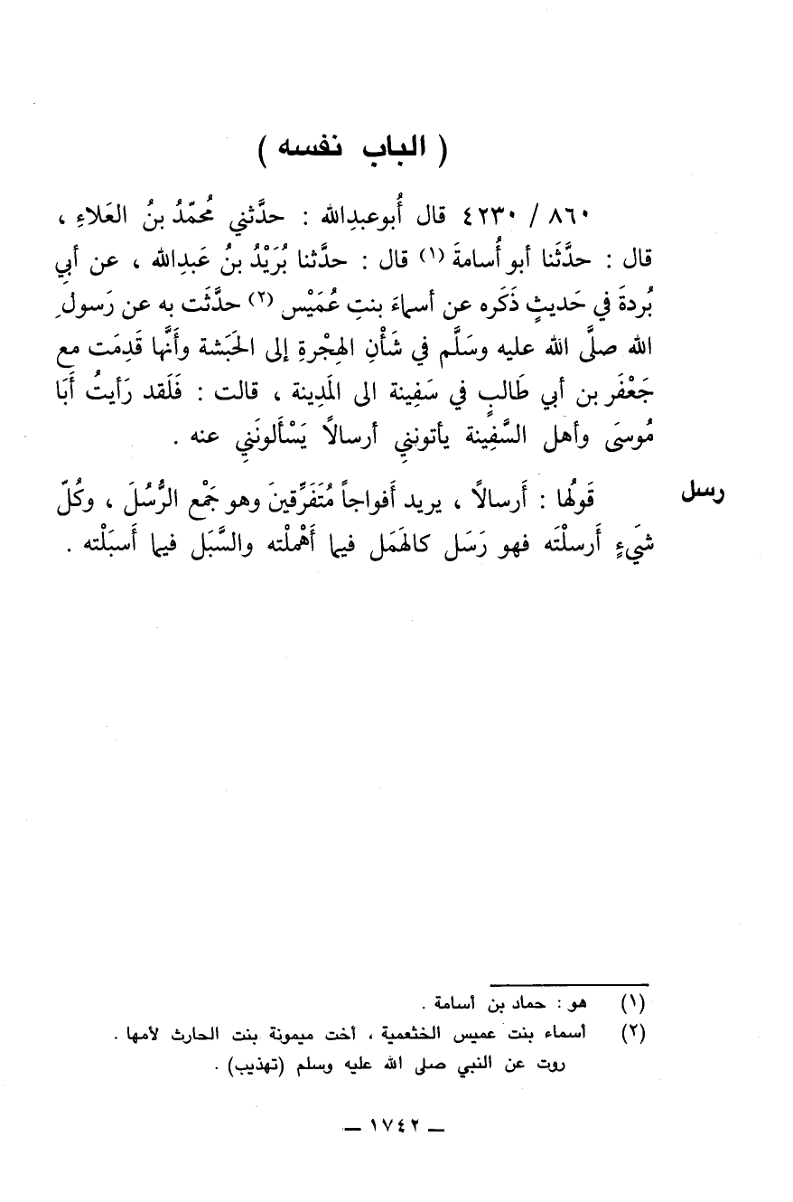 860/ 4230 - قال أبو عبدالله: حَدَّثَنِي مُحَمَّدُ بْنُ الْعَلاَءِ قال: حَدَّثَنَا أَبُو أُسَامَةَ قال: حَدَّثَنَا بُرَيْدُ بْنُ عَبْدِ اللَّهِ عَنْ أَبِي بُرْدَةَ في حديث ذكره عن أسماء بنت عميس حدثت به عن رسول الله صلى الله عليه وسلم في شأن الهجرة إلى الحبشة وأنها قدمت مع جَعْفَرَ بْنَ أَبِى طَالِبٍ في سَفِينَةِ إِلَى المدينة قَالَتْ: فَلَقَدْ رَأَيْتُ أَبَا مُوسَى وَأَهل السَّفِينَةِ يَاتُونني أَرْسَالاً، يَسْأَلُونني عَنْه.