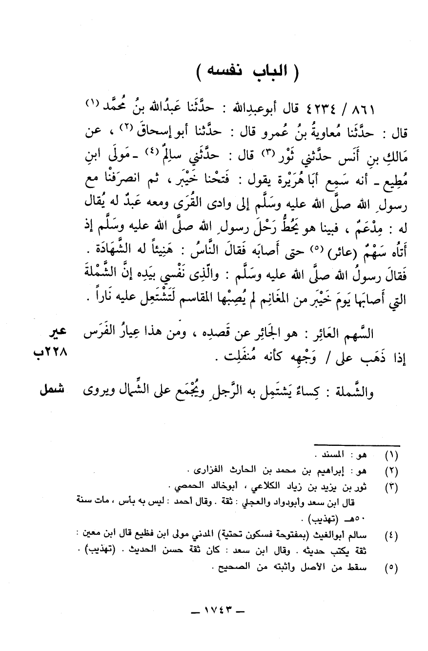 861/ 4234 - قال أبو عبدالله: حَدَّثَنَا عَبْدُ اللَّهِ بْنُ مُحَمَّدٍ قال: حَدَّثَنَا مُعَاوِيَةُ بْنُ عَمْرٍو قال: حَدَّثَنَا أَبُو إِسْحَاقَ عَنْ مَالِكِ بْنِ أَنَسٍ حَدَّثَنِي ثَوْرٌ قَالَ: حَدَّثَنِي سَالِمٌ -مَوْلَى ابْنِ مُطِيعٍ- أَنَّهُ سَمِعَ أَبَا هُرَيْرَةَ - رضى الله عنه - يَقُولُ: فتَحْنَا خَيْبَرَ،، ثُمَّ انْصَرَفْنَا مَعَ رَسُولِ اللَّهِ صلى الله عليه وسلم إِلَى وَادِى الْقُرَى، وَمَعَهُ عَبْدٌ لَهُ يُقَالُ لَهُ: مِدْعَمٌ، فَبَيْنَا هُوَ يَحُطُّ رَحْلَ رَسُولِ اللَّهِ صلى الله عليه وسلم إِذْ أتاه سَهْمٌ عَائِرٌ حَتَّى أَصَابَه، فَقَالَ النَّاسُ: هَنِيئاً لَهُ الشَّهَادَةُ. فَقَالَ رَسُولُ اللَّهِ صلى الله عليه وسلم: «وَالَّذِى نَفْسِي بِيَدِهِ، إِنَّ الشَّمْلَةَ الَّتِي أَصَابَهَا يَوْمَ خَيْبَرَ مِنَ الْمَغَانِمِ لَمْ يُصِبْهَا الْمَقَاسِمُ لَتَشْتَعِلُ عَلَيْهِ نَاراً».
