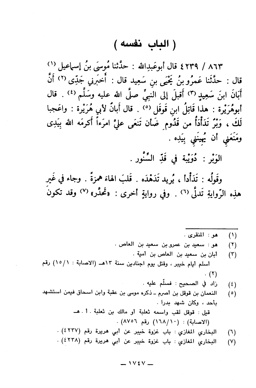 863/ 4239 - قال أبو عبدالله: حَدَّثَنَا مُوسَى بْنُ إِسْمَاعِيلَ قال: حَدَّثَنَا عَمْرُو بْنُ يَحْيَى بْنِ سَعِيدٍ قَالَ: أَخْبَرَنِي جَدِّى أَنَّ أَبَانَ ابْنَ سَعِيدٍ أَقْبَلَ إِلَى النَّبِيِّ صلى الله عليه وسلم، قَالَ أَبُو هُرَيْرَةَ: هَذَا قَاتِلُ ابْنِ قَوْقَلٍ. قَالَ أَبَانُ لأَبِي هُرَيْرَةَ: وَاعَجَباً لَكَ وَبْرٌ تَدَادَأَ مِنْ قَدُومِ ضَانٍ. تَنْعَى عَلَيَّ امْرَأً أَكْرَمَهُ اللَّهُ بِيَدِي، وَمَنَعَني أَنْ يُهِينَنِي بِيَدِهِ.