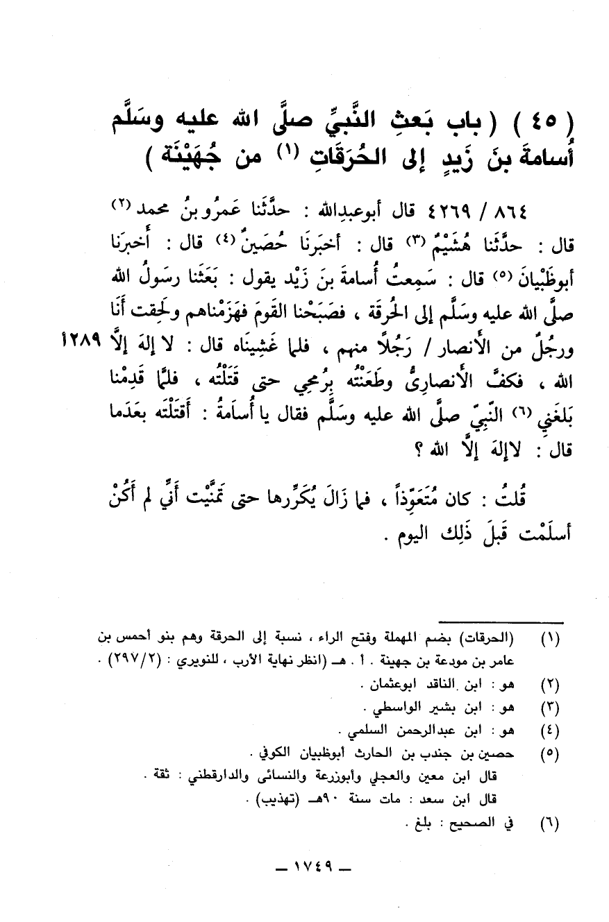 864/ 4269 - قال أبوعبدالله: حَدَّثَنا عَمْرُو بْنُ مُحَمَّدٍ قال: حَدَّثَنَا هُشَيْمٌ قال: أَخْبَرَنَا حُصَيْنٌ قال: أَخْبَرَنَا أَبُو ظَبْيَانَ قَالَ: سَمِعْتُ أُسَامَةَ بْنَ زَيْدٍ - رضى الله عنهما - يَقُولُ: بَعَثَنَا رَسُولُ اللَّهِ صلى الله عليه وسلم إِلَى الْحُرَقَةِ، فَصَبَحْنَا الْقَوْمَ فَهَزَمْنَاهُمْ وَلَحِقْتُ أَنَا وَرَجُلٌ مِنَ الأَنْصَارِ / رَجُلاً مِنْهُمْ، فَلَمَّا غَشِينَاهُ قَالَ: لاَ إِلَهَ إِلاَّ اللَّهُ. فَكَفَّ الأَنْصَارِىُّ، وَطَعَنْتُهُ بِرُمْحِي حَتَّى قَتَلْتُهُ، فَلَمَّا قَدِمْنَا بَلَغني النَّبِيَّ صلى الله عليه وسلم فَقَالَ: «يَا أُسَامَةُ أَقَتَلْتَهُ بَعْدَ مَا قَالَ لاَ إِلَهَ إِلاَّ اللَّهُ؟» قُلْتُ: كَانَ مُتَعَوِّذاً. فَمَا زَالَ يُكَرِّرُهَا حَتَّى تَمَنَّيْتُ أَنِّي لَمْ أَكُنْ أَسْلَمْتُ قَبْلَ ذَلِكَ الْيَوْمِ.