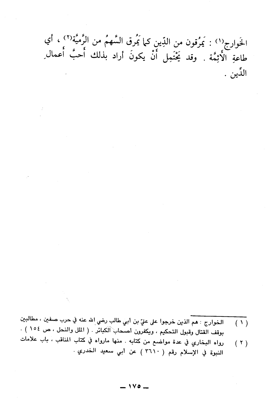 الخوارج: يمرقون من الدين كما يمرق السهم من الرمية، أي طاعة الأئمة. وقد يحتمل أن يكون أراد بذلك أحب أعمال الدين.