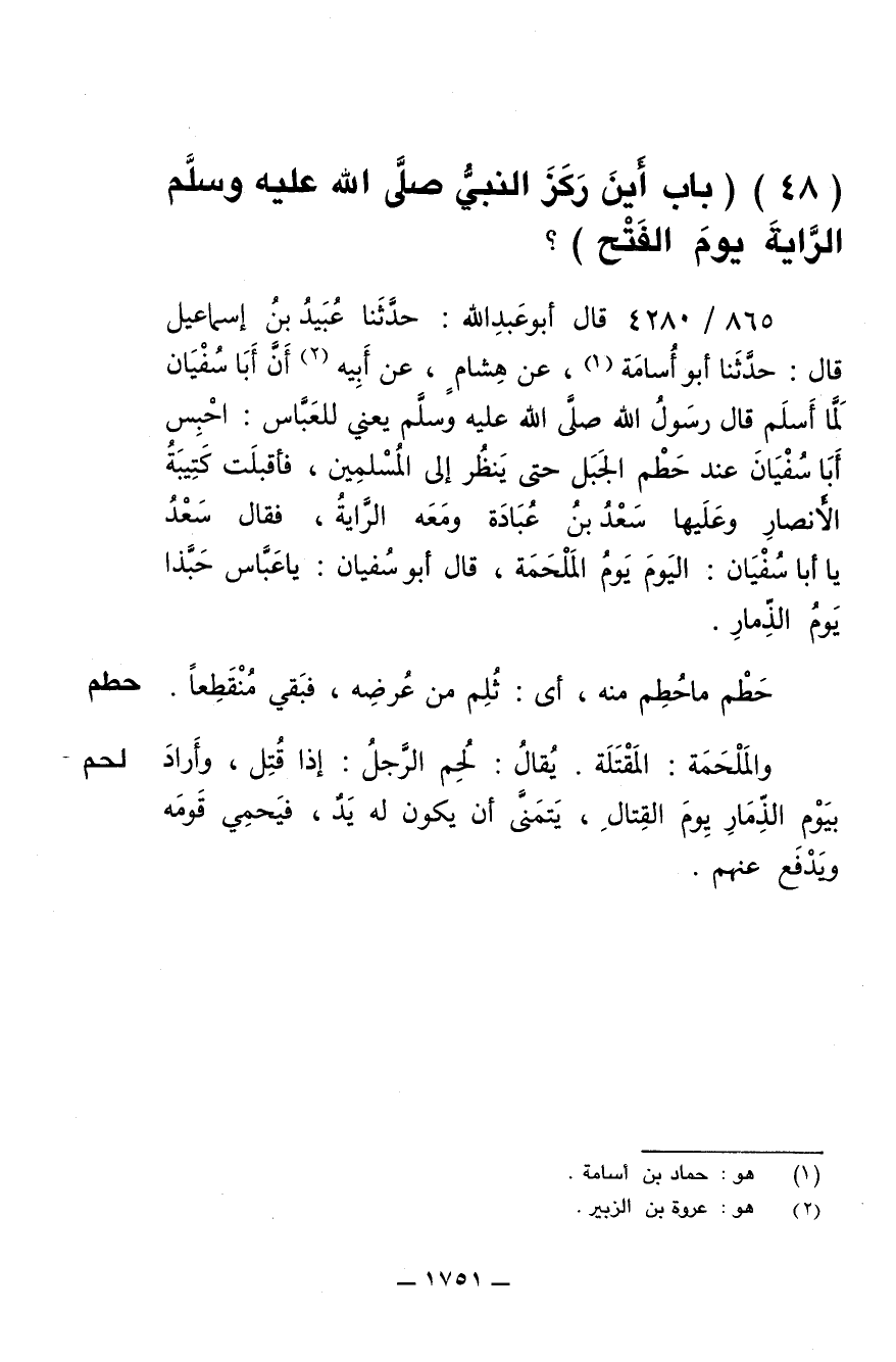 865/ 4280 - قال أبوعبدالله: حَدَّثَنَا عُبَيْدُ بْنُ إِسْمَاعِيلَ قال: حَدَّثَنَا أَبُو أُسَامَةَ عَنْ هِشَامٍ عَنْ أَبِيهِ أنَّ أَبا سُفْيَانَ لما أَسْلَمَ قال رسول الله صلى الله عليه وسلم يعني لِلْعَبَّاسِ: «احْبِسْ أَبَا سُفْيَانَ عِنْدَ حَطْمِ الْجَبَلِ حَتَّى يَنْظُرَ إِلَى الْمُسْلِمِينَ». فأَقْبَلَتْ كَتِيبَةُ الأَنْصَارِ وعَلَيْها سَعْدُ بْنُ عُبَادَةَ ومَعَهُ الرَّايَةُ. فَقَالَ سَعْدُ يا أَبَا سُفْيَانَ: الْيَوْمَ يَوْمُ الْمَلْحَمَةِ، قَالَ أَبُو سُفْيَانَ: يَا عَبَّاسُ حَبَّذَا يَوْمُ الذِّمَارِ.
