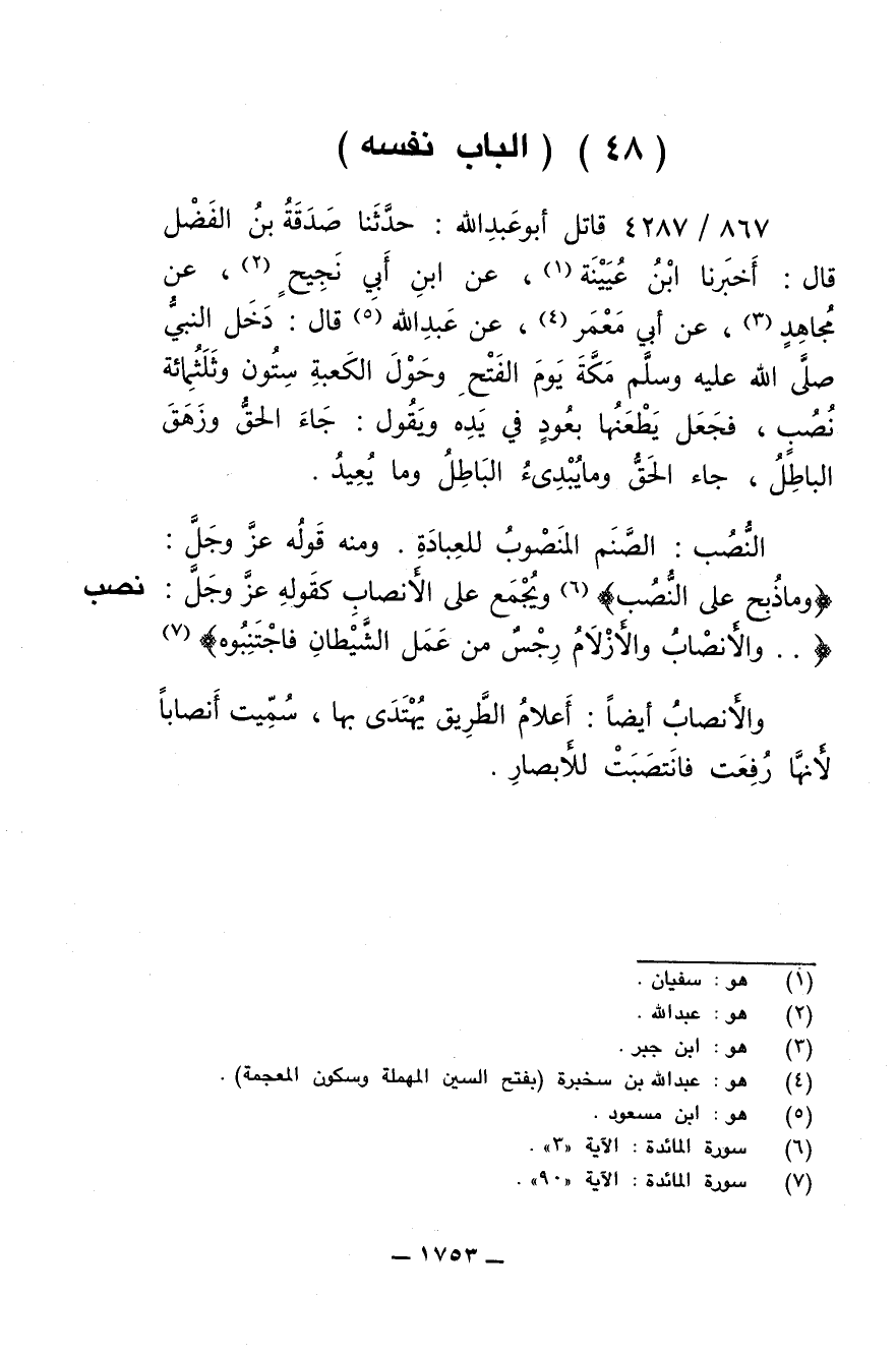 867/ 4287 - قال أبو عبدالله: حَدَّثَنَا صَدَقَةُ بْنُ الْفَضْلِ قال: أَخْبَرَنَا ابْنُ عُيَيْنَةَ عَنِ ابْنِ أَبِي نَجِيحٍ عَنْ مُجَاهِدٍ عَنْ أَبِى مَعْمَرٍ عَنْ عَبْدِ اللَّهِ - رضى الله عنه - قَالَ: دَخَلَ النَّبِيُّ صلى الله عليه وسلم مَكَّةَ يَوْمَ الْفَتْحِ وَحَوْلَ الْكَعبةِ سِتُّونَ وَثَلاَثُمِائَةِ نُصُبٍ، فَجَعَلَ يَطْعُنُهَا بِعُودٍ فِي يَدِهِ وَيَقُولُ: «جَاءَ الْحَقُّ وَزَهَقَ الْبَاطِلُ، جَاءَ الْحَقُّ، وَمَا يُبْدِئُ الْبَاطِلُ وَمَا يُعِيدُ».
