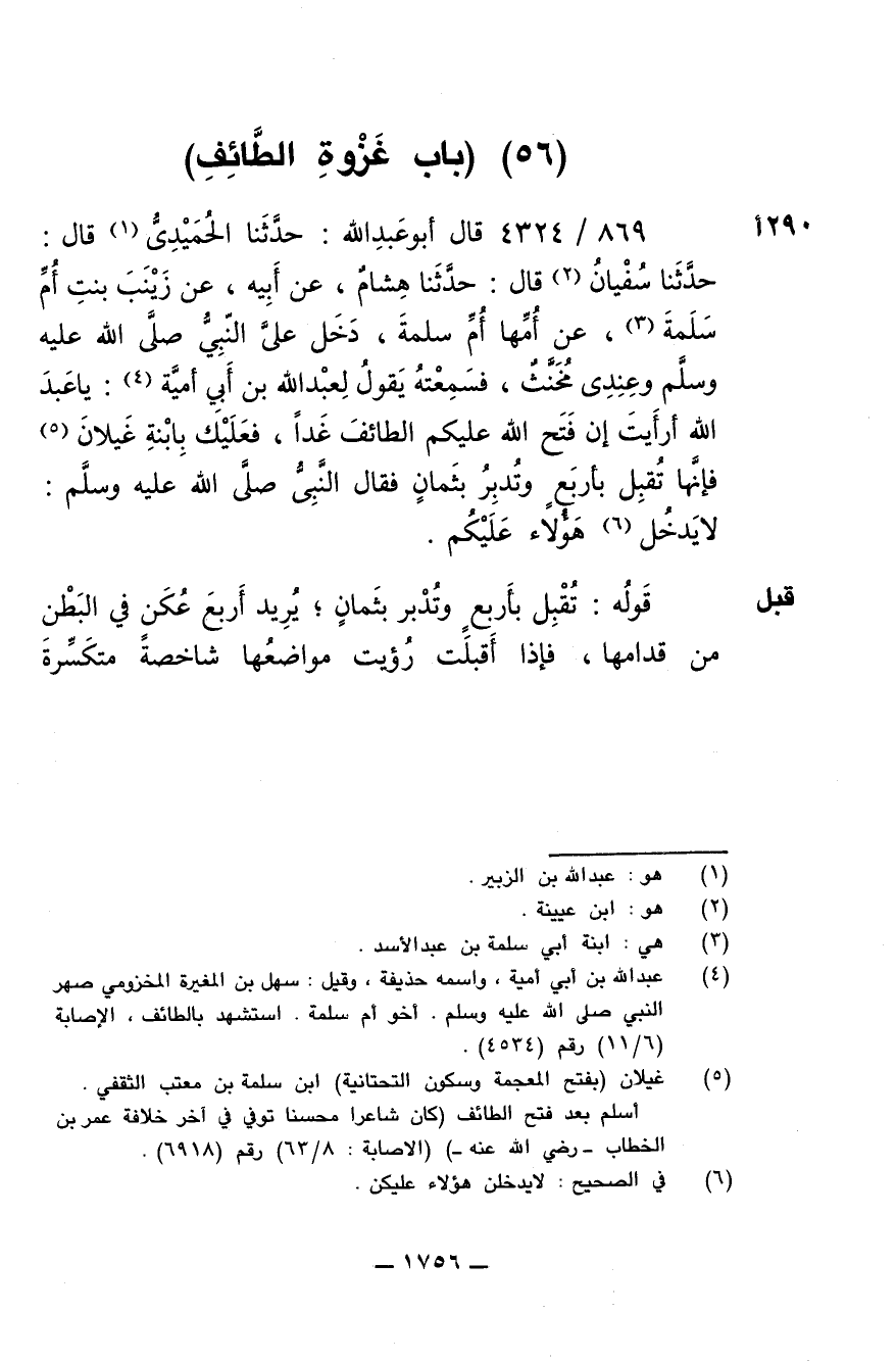 869/ 4324 - قال أبو عبدالله: حَدَّثَنَا الْحُمَيْدِىُّ قال: حدثنا سُفْيَانَ قال: حَدَّثَنَا هِشَامٌ عَنْ أَبِيهِ عَنْ زَيْنَبَ بنتِ أم سَلَمَةَ عَنْ أُمِّهَا أُمِّ سَلَمَةَ - رضى الله عنها - دَخَلَ عَلَىَّ النَّبِيُّ صلى الله عليه وسلم وَعِنْدِى مُخَنَّثٌ، فَسَمِعْتُهُ يَقُولُ لِعَبْدِ اللَّهِ بْنِ أَبِي أُمَيَّةَ: يَا عَبْدَ اللَّهِ أَرَأَيْتَ إِنْ فَتَحَ اللَّهُ عَلَيْكُمُ الطَّائِفَ غَداً فَعَلَيْكَ بِابْنَةِ غَيْلاَنَ، فَإِنَّهَا تُقْبِلُ بِأَرْبَعٍ وَتُدْبِرُ بِثَمَانٍ. فَقَالَ النَّبِيُّ صلى الله عليه وسلم «لاَ يَدْخُل هَؤُلاَءِ عَلَيْكُم».