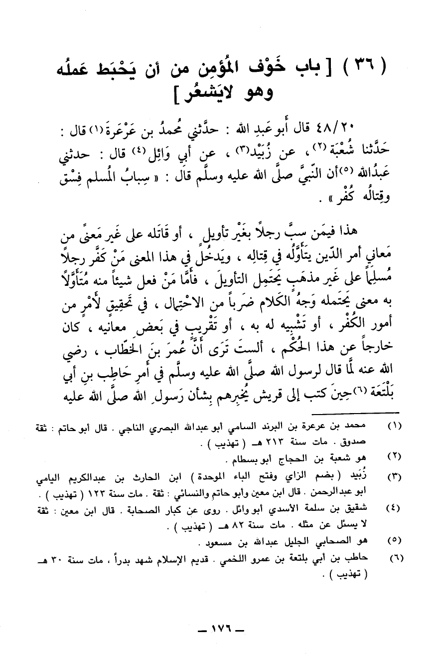 20/ 48 - قال أبو عبد الله: حدثني محمد بن عرعرة قال: حدثنا شعبة، عن زبيد، عن أبي وائل قال: حدثني عبد الله أن النبي صلى الله عليه وسلم قال: (سباب المسلم فسق وقتاله كفر).