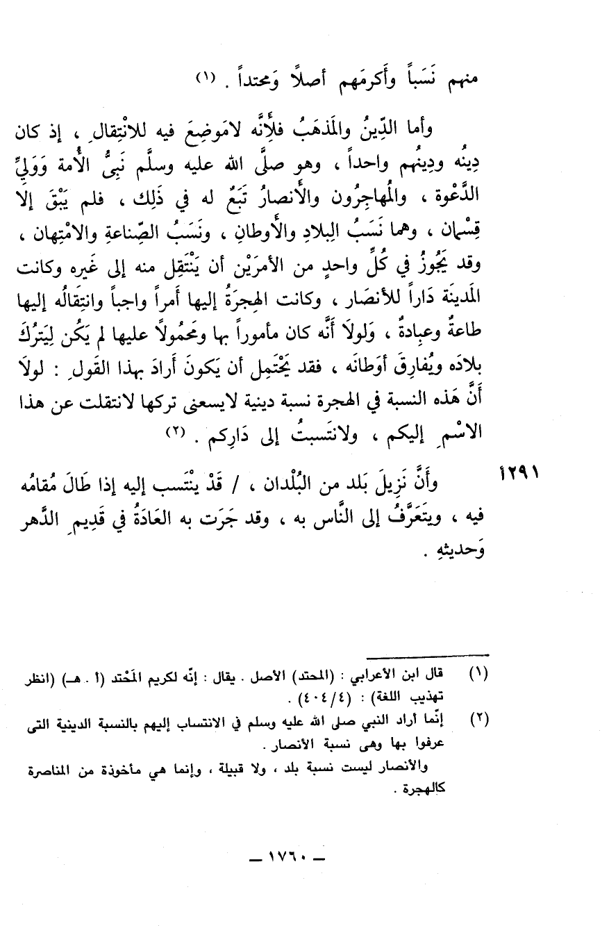 وأما الدين والمذهب فلأنه لا موضع فيه للانتقال، إذ كان دينه ودينهم واحدا، وهو صلى الله عليه وسلم نبىُّ الأمة وولي الدعوة، والمهاجرون والأنصار تبع له في ذلك، فلم يبق إلا قسمان، وهما نسب البلاد والأوطان، ونسب الصناعة والامتهان، وقد يجوز في كل واحد من الأمرين أن ينتقل منه إلى غيره وكانت المدينة دارا للأنصار، وكانت الهجرة إليها أمرا واجبا وانتقاله إليها طاعة وعبادة، ولولا أنه كان مأمورا بها ومحمولا عليها لم يكن ليترك بلاده ويفارق أوطانه، فقد يحتمل أن يكون أراد بهذا القول: لولا أن هذه النسبة في الهجرة نسبة دينية لا يسعني تركها لانتقلت عن هذا الاسم إليكم، ولانتسبت إلى داركم.