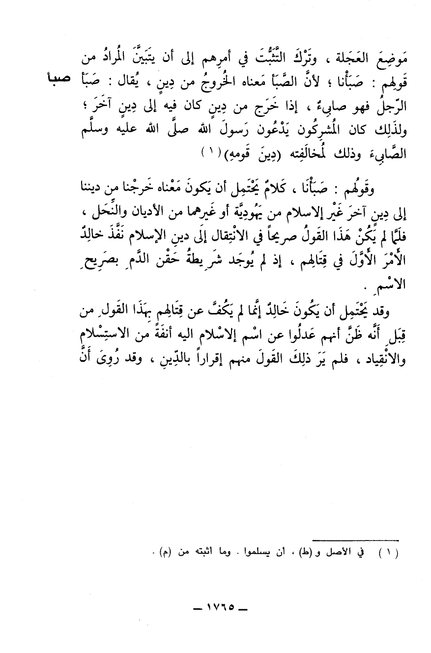 وقولهم: صبأنا، كلام يحتمل أن يكون معناه خرجنا من ديننا إلى دين آخر غير الإسلام من يهودية أو غيرهما من الأديان والنحل، فلما لم يكن هذا القول صريحا في الانتقال إلى دين الإسلام نفَّذ خالد الأمر الأول في قتالهم، إذ لم يوجد شريطة حقن الدم بصريح الاسم.