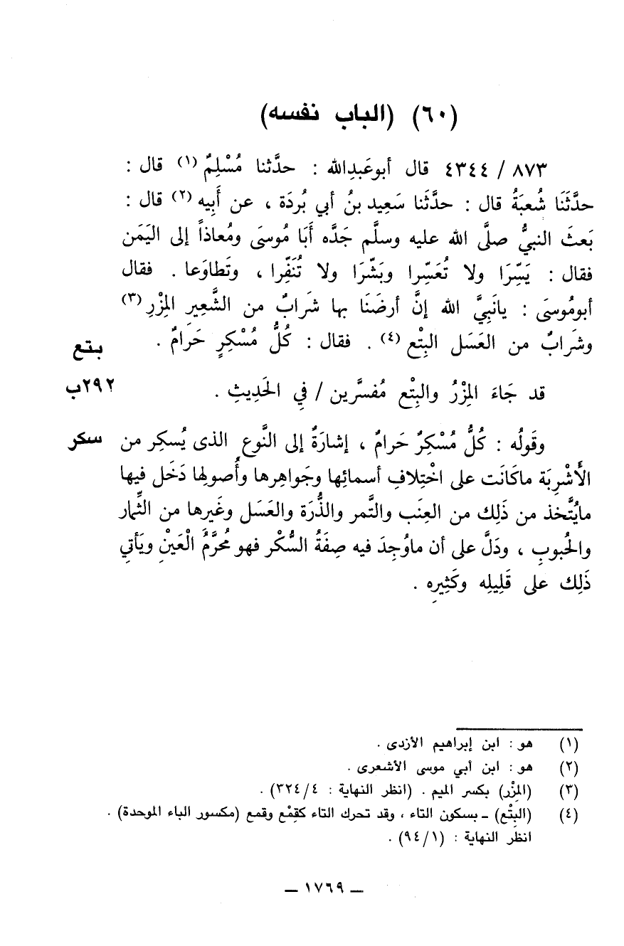 873/ 4344 - قال أبو عبدالله: حَدَّثَنَا مُسْلِمٌ قال: حَدَّثَنَا شُعْبَةُ قال: حَدَّثَنَا سَعِيدُ بْنُ أَبِى بُرْدَةَ عَنْ أَبِيهِ قَالَ: بَعَثَ النَّبِيُّ صلى الله عليه وسلم جَدَّهُ أَبَا مُوسَى، وَمُعَاذاً إِلَى الْيَمَنِ فَقَالَ: «يَسِّرَا وَلاَ تُعَسِّرَا، وَبَشِّرَا وَلاَ تُنَفِّرَا، وَتَطَاوَعَا». فَقَالَ أَبُو مُوسَى يَا نَبِيَّ اللَّهِ، إِنَّ أَرْضَنَا بِهَا شَرَابٌ مِنَ الشَّعِيرِ الْمِزْرِ، وَشَرَابٌ مِنَ الْعَسَلِ الْبِتْع. فَقَالَ «كُلُّ مُسْكِرٍ حَرَامٌ».