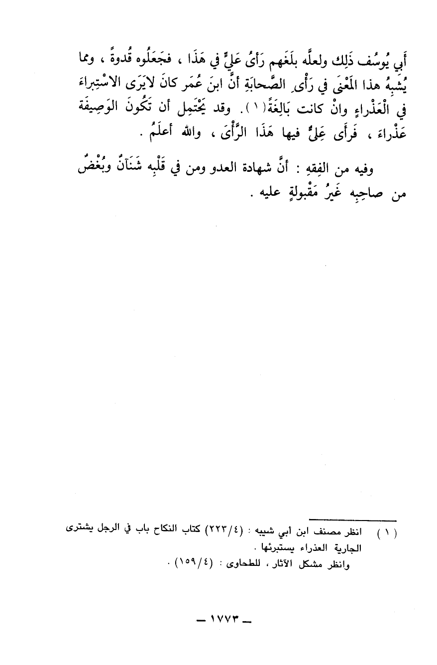 أبي يوسف ذلك ولعله بلغهم رأىُ علي في هذا، فجعلوه قدوة، ومما يشبه هذا المعنى في رأىِ الصحابة أن ابن عمر كان لا يرى الاستبراء في العذراء وإن كانت بالغة. وقد يحتمل أن تكون الوصيفة عذراء، فرأى علىٌّ فيها هذا الرأىَ، والله أعلم.