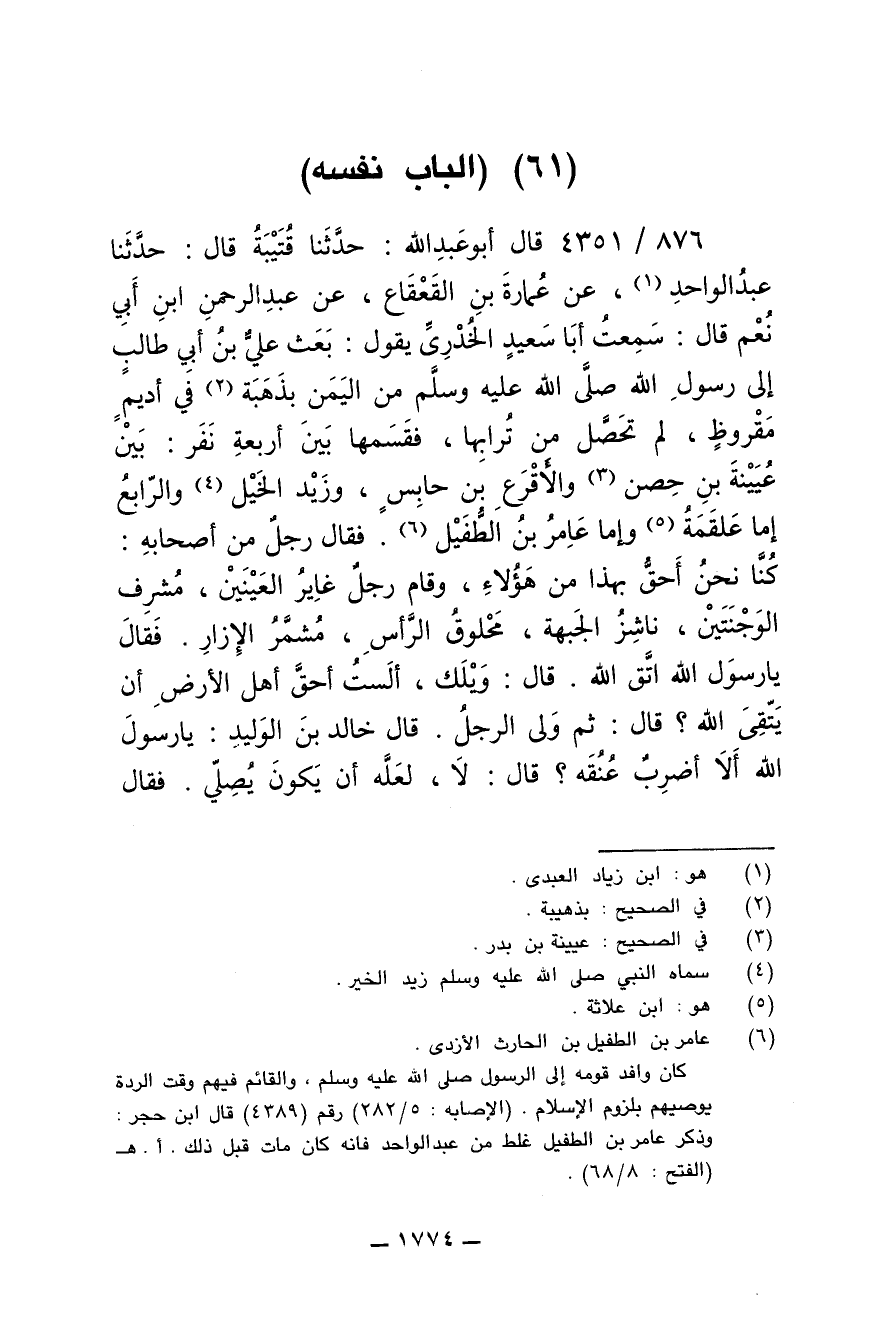 876/ 4351 - قال أبو عبدالله: حَدَّثَنَا قُتَيْبَةُ قال: حَدَّثَنَا عَبْدُ الْوَاحِدِ عَنْ عُمَارَةَ بْنِ الْقَعْقَاعِ عن عَبْدُ الرَّحْمَنِ ابْنِ أَبِي نُعْمٍ قَالَ: سَمِعْتُ أَبَا سَعِيدٍ الْخُدْرِىَّ يَقُولُ: بَعَثَ عَلِيُّ بْنُ أَبِى طَالِبٍ - رضى الله عنه - إِلَى رَسُولِ اللَّهِ صلى الله عليه وسلم مِنَ الْيَمَنِ بِذُهَبَةٍ فِي أَدِيمٍ مَقْرُوظٍ لَمْ تُحَصَّلْ مِنْ تُرَابِهَا، فَقَسَمَهَا بَيْنَ أَرْبَعَةِ نَفَرٍ: بَيْنَ عُيَيْنَةَ بْنِ حِصن، وَالأَقْرَعَ بْنِ حَابِسٍ وَزَيْدِ الْخَيْلِ، وَالرَّابِعُ إِمَّا عَلْقَمَةُ وَإِمَّا عَامِرُ بْنُ الطُّفَيْلِ، فَقَالَ رَجُلٌ مِنْ أَصْحَابِهِ: كُنَّا نَحْنُ أَحَقَّ بِهَذَا مِنْ هَؤُلاَءِ، وَقَامَ رَجُلٌ غَايِرُ الْعَيْنَيْن، مُشْرِفُ الْوَجْنَتَيْنِ، نَاشِزُ الْجَبْهَةِ، مَحْلُوقُ الرَّاسِ، مُشَمَّرُ الإِزَارِ، فَقَالَ يَا رَسُولَ اللَّهِ اتَّقِ اللَّهَ. قَالَ: «وَيْلَكَ أَلَسْتُ أَحَقَّ أَهْلِ الأَرْضِ أَنْ يَتَّقِىَ اللَّهَ؟». قَالَ: ثُمَّ وَلَّى الرَّجُلُ، قَالَ خَالِدُ بْنُ الْوَلِيدِ: يَا رَسُولَ اللَّهِ، أَلاَ أَضْرِبُ عُنُقَهُ؟ قَالَ: «لاَ، لَعَلَّهُ أَنْ يَكُونَ يُصَلِّي». فَقَالَ