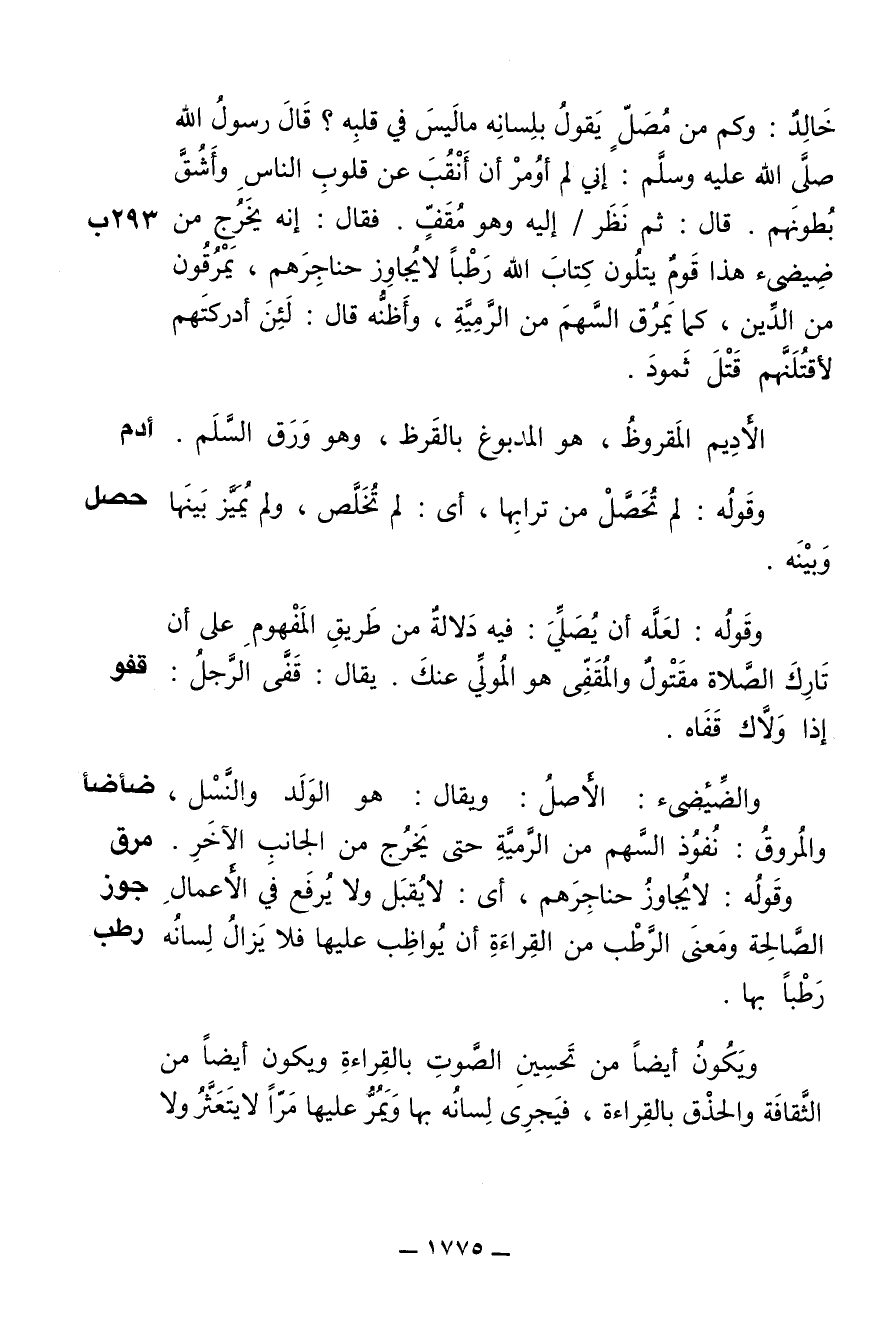 خَالِدٌ: وَكَمْ مِنْ مُصَلٍّ يَقُولُ بِلِسَانِهِ مَا لَيْسَ فِي قَلْبِهِ؟ قَالَ رَسُولُ اللَّهِ صلى الله عليه وسلم: «إِنِّي لَمْ أُومَرْ أَنْ أَنْقُبَ عن قُلُوبِ النَّاسِ، وَأَشُقَّ بُطُونَهُمْ» قَالَ: ثُمَّ نَظَرَ / إِلَيْهِ وَهْوَ مُقَفٍّ فَقَالَ: «إِنَّهُ يَخْرُجُ مِنْ ضِئْضِئِ هَذَا قَوْمٌ يَتْلُونَ كِتَابَ اللَّهِ رَطْباً، لاَ يُجَاوِزُ حَنَاجِرَهُمْ، يَمْرُقُونَ مِنَ الدِّينِ كَمَا يَمْرُقُ السَّهْمُ مِنَ الرَّمِيَّةِ». وَأَظُنُّهُ قَالَ: «لَئِنْ أَدْرَكْتُهُمْ لأَقْتُلَنَّهُمْ قَتْلَ ثَمُودَ».