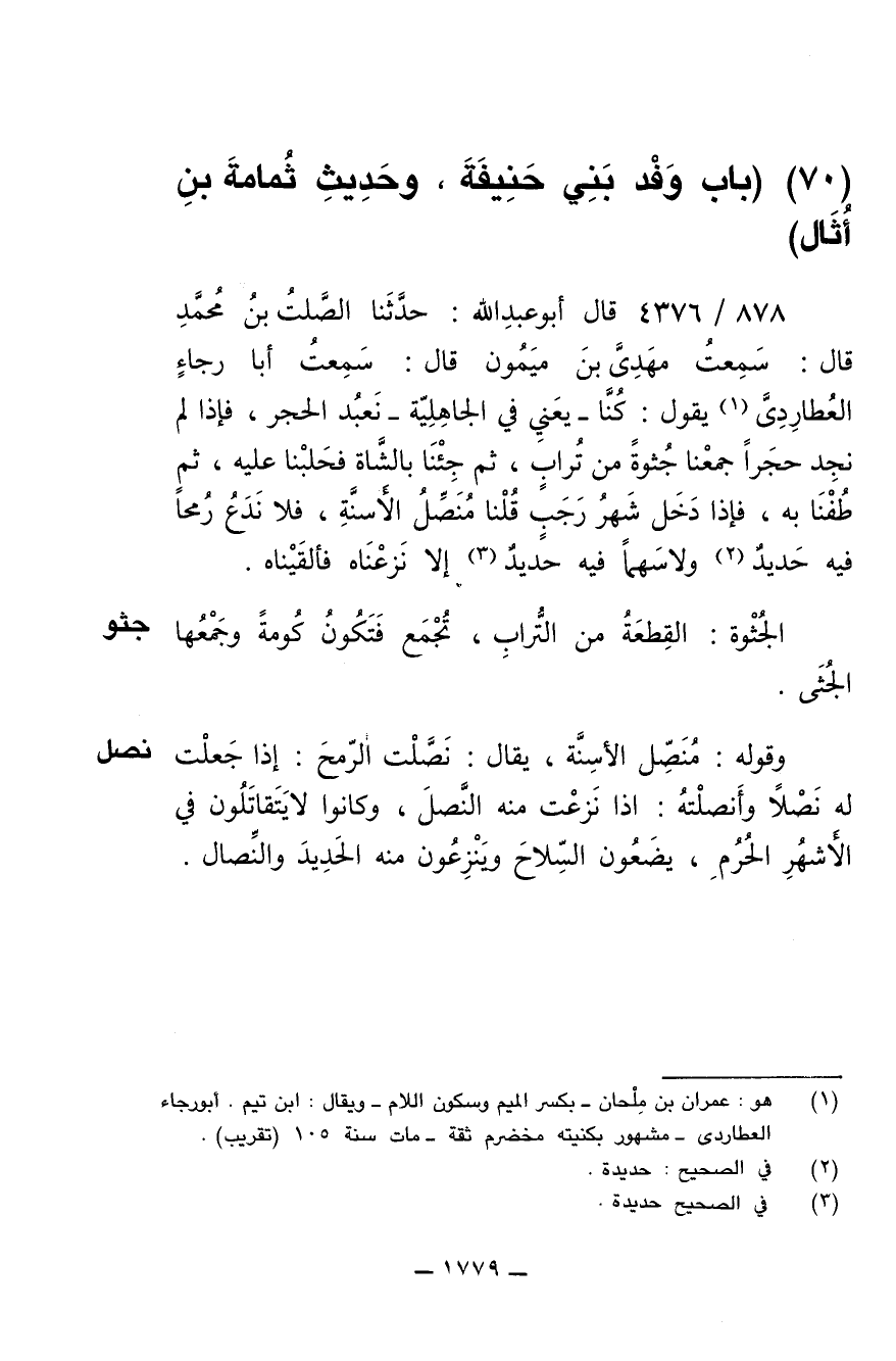 878/ 4376 - قال أبو عبدالله: حَدَّثَنَا الصَّلْتُ بْنُ مُحَمَّدٍ قَالَ: سَمِعْتُ مَهْدِىَّ بْنَ مَيْمُونٍ قَالَ: سَمِعْتُ أَبَا رَجَاءٍ الْعُطَارِدِىَّ يَقُولُ: كُنَّا -يعني في الجاهلية- نَعْبُدُ الْحَجَرَ، فَإِذَا لم نجد حَجَراً هُوَ أَخْيَرُ مِنْهُ أَلْقَيْنَاهُ وَأَخَذْنَا الآخَرَ، فَإِذَا لَمْ نَجِدْ حَجَراً جَمَعْنَا جُثْوَةً مِنْ تُرَابٍ، ثُمَّ جِئْنَا بِالشَّاةِ فَحَلَبْنَاهُ عَلَيْهِ، ثُمَّ طُفْنَا بِهِ، فَإِذَا دَخَلَ شَهْرُ رَجَبٍ قُلْنَا مُنَصِّلُ الأَسِنَّةِ. فَلاَ نَدَعُ رُمْحاً فِيهِ حَدِيدٌ وَلاَ سَهْماً فِيهِ حَدِيدٌ إِلاَّ نَزَعْنَاهُ فَأَلْقَيْنَاهُ.