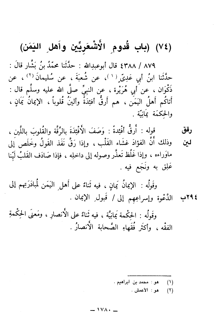 879/ 4388 - قال أبو عبدالله: حَدَّثَنَا مُحَمَّدُ بْنُ بَشَّارٍ قال: حَدَّثَنَا ابْنُ أَبِي عَدِىٍّ عَنْ شُعْبَةَ عَنْ سُلَيْمَانَ عَنْ ذَكْوَانَ عَنْ أَبِى هُرَيْرَةَ - رضى الله عنه - عَنِ النَّبِيِّ صلى الله عليه وسلم قَالَ: «أَتَاكُمْ أَهْلُ الْيَمَنِ، هُمْ أَرَقُّ أَفْئِدَةً وَأَلْيَنُ قُلُوباً، الإِيمَانُ يَمَانٍ وَالْحِكْمَةُ يَمَانِيَةٌ».