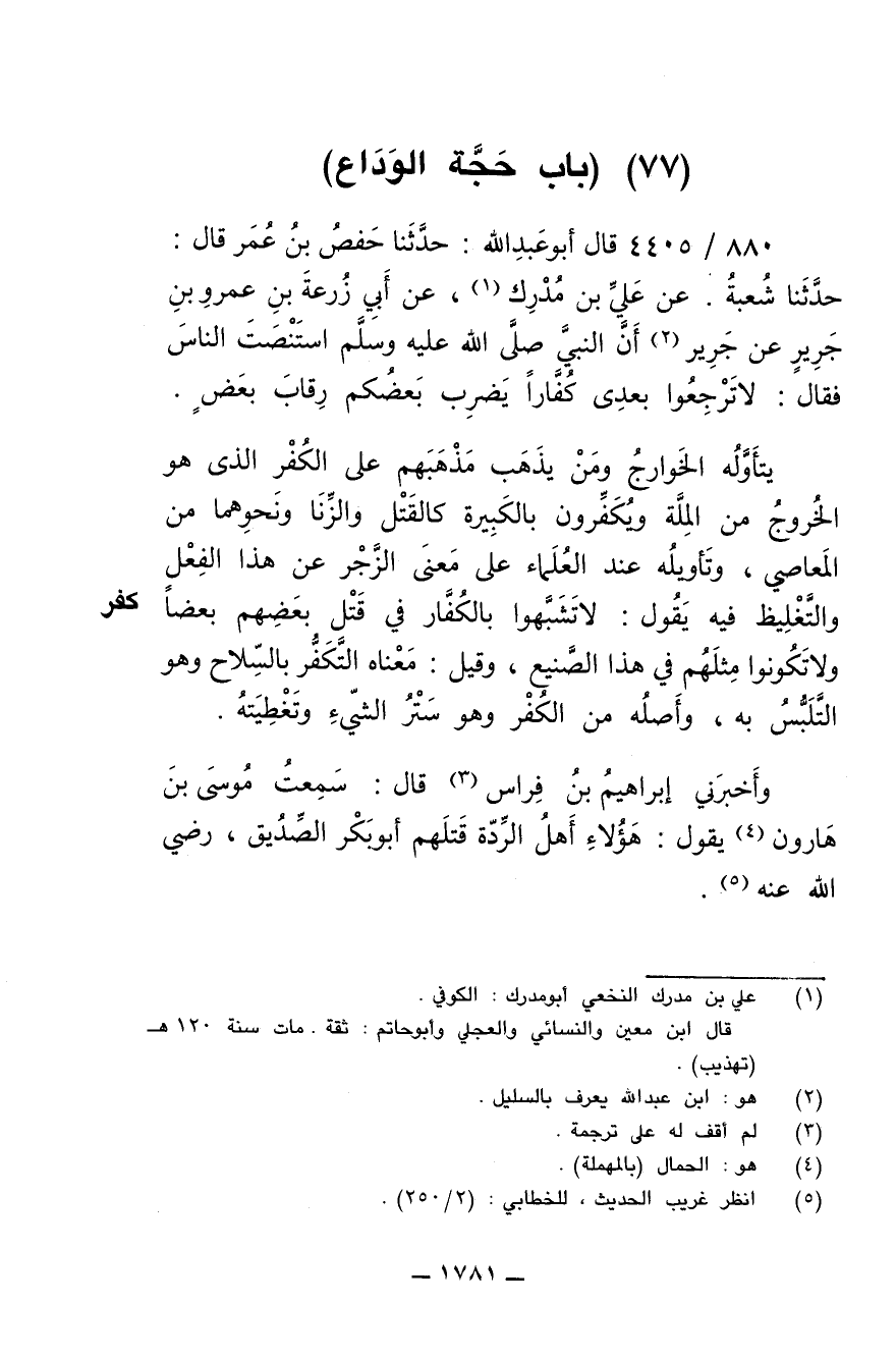 880/ 4405 - قال أبو عبدالله: حَدَّثَنَا حَفْصُ بْنُ عُمَرَ قال: حَدَّثْنَا شُعْبَةُ عَنْ عَلِيِّ بْنِ مُدْرِكٍ عَنْ أَبِي زُرْعَةَ بْنِ عَمْرِو بْنِ جَرِيرٍ عَنْ جَرِيرٍ أَنَّ النَّبِيَّ صلى الله عليه وسلم اسْتَنْصَتَ النَّاسَ فَقَالَ: «لاَ تَرْجِعُوا بَعْدِى كُفَّاراً، يَضْرِبُ بَعْضُكُمْ رِقَابَ بَعْضٍ». يتأوله الخوارج ومن يذهب مذهبهم على الكفر الذي هو الخروج من الملة ويكفرون بالكبيرة كالقتل والزنا ونحوهما من المعاصي، وتأويله عند العلماء على معنى الزجر عن هذا الفعل والتغليظ فيه يقول: لا تشبهوا بالكفار في قتل بعضهم بعضا ولا تكونوا مثلهم في هذا الصنيع، وقيل: معناه التكفر بالسلاح وهو التلبس به، وأصله من الكفر وهو ستر الشيء وتغطيته.