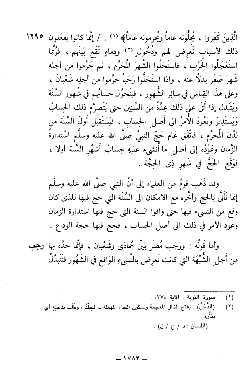 الذين كفروا يحلونه عاما ويحرمونه عاما}. / إنما كانوا يفعلون ذلك لأسباب تعرض لهم وذحول ودماء تقع بينهم، فربما استعجلوا الحرب، فاستحلوا الشهر المحرم، ثم حرموا من أجله شهر صفر بدلا عنه، وإذا استحلوا رجبا حرموا من أجله شعبان، وعلى هذا القياس في سائر الشهور، فيتحول حسابهم في شهور السنة ويتبدل إذا أتى على ذلك عدة من السنين حتى يتصرم ذلك الحساب ويستدير ويعود الأمر إلى أصل الحساب، فيستقبل أول السنة من لدن المحرم، فاتفق عام حج النبي صلى الله عليه وسلم استدارة الزمان وعوده إلى أصل ما أنشئ عليه حساب أشهر السنة أولا، فوقع الحج في شهر ذي الحجة.