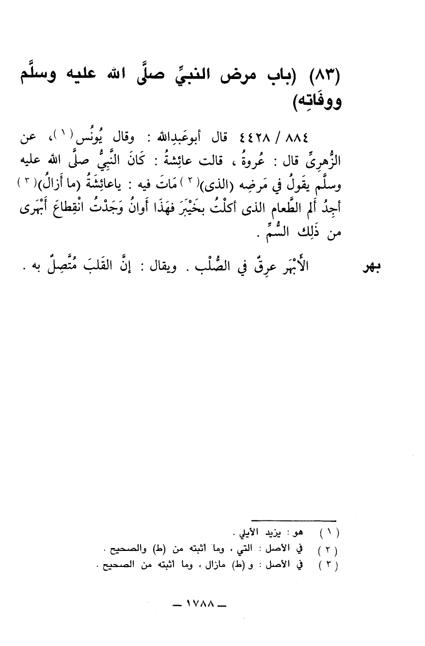 884/ 4428 - قال أبوعبدالله: وَقَالَ يُونُسُ عَنِ الزُّهْرِىِّ قَالَ: عُرْوَةُ قَالَتْ عَائِشَةُ - رضى الله عنها -: كَانَ النَّبِيُّ صلى الله عليه وسلم يَقُولُ فِي مَرَضِهِ الَّذِى مَاتَ فِيهِ: «يَا عَائِشَةُ مَا أَزَالُ أَجِدُ أَلَمَ الطَّعَامِ الَّذِى أَكَلْتُ بِخَيْبَرَ، فَهَذَا أَوَانُ وَجَدْتُ انْقِطَاعَ أَبْهَرِى مِنْ ذَلِكَ السَّمِّ».