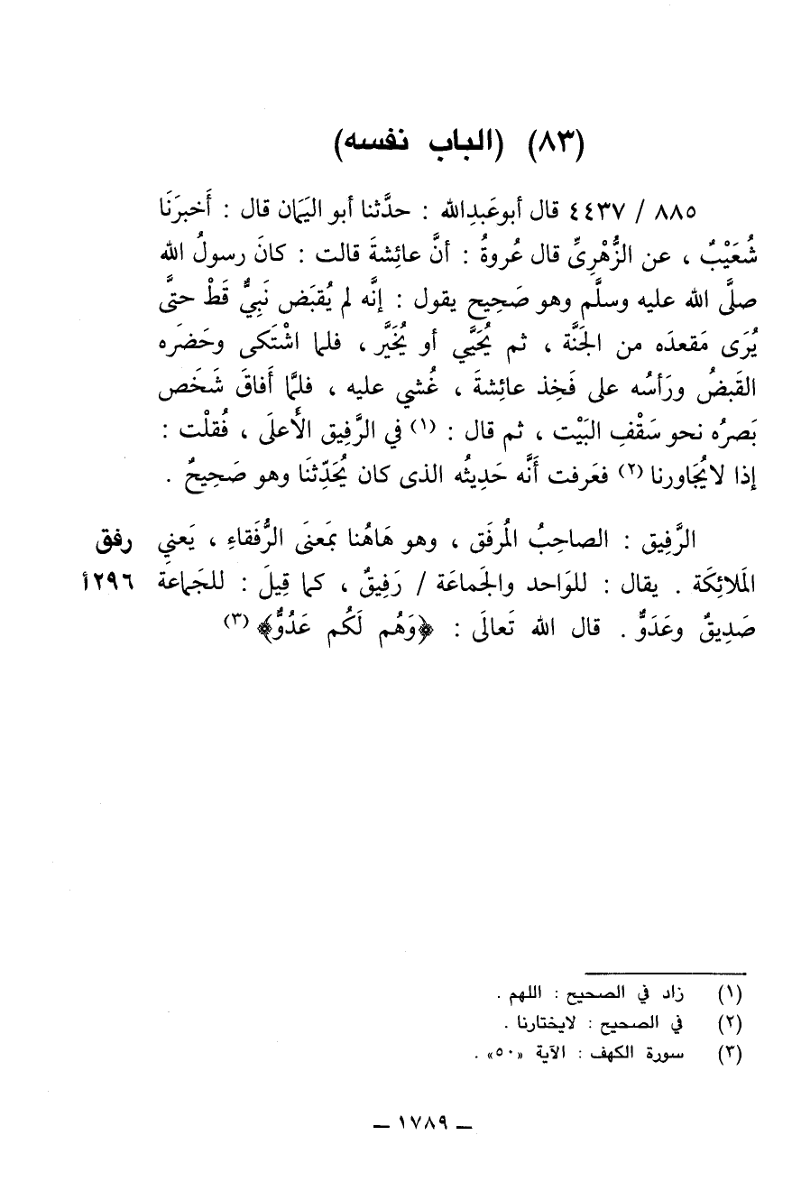 885/ 4437 - قال أبوعبدالله: حَدَّثَنَا أَبُو الْيَمَانِ قال: أَخْبَرَنَا شُعَيْبٌ عَنِ الزُّهْرِىِّ قَالَ عُرْوَةُ: أنَّ عَائِشَةَ قَالَتْ: كَانَ رَسُولُ اللَّهِ صلى الله عليه وسلم وَهْوَ صَحِيحٌ يَقُولُ: «إِنَّهُ لَمْ يُقْبَضْ نَبِيٌّ قَطُّ حَتَّى يَرَى مَقْعَدَهُ مِنَ الْجَنَّةِ ثُمَّ يُحَيَّي أَوْ يُخَيَّرَ». فَلَمَّا اشْتَكَى وَحَضَرَهُ الْقَبْضُ وَرَاسُهُ عَلَى فَخِذِ عَائِشَةَ، غُشِيَ عَلَيْهِ، فَلَمَّا أَفَاقَ شَخَصَ بَصَرُهُ نَحْوَ سَقْفِ الْبَيْتِ ثُمَّ قَالَ: «فِي الرَّفِيقِ الأَعْلَى». فَقُلْتُ: إِذاً لاَ يُجَاوِرُنَا. فَعَرَفْتُ أَنَّهُ حَدِيثُهُ الَّذِى كَانَ يُحَدِّثُنَا وَهْوَ صَحِيحٌ.