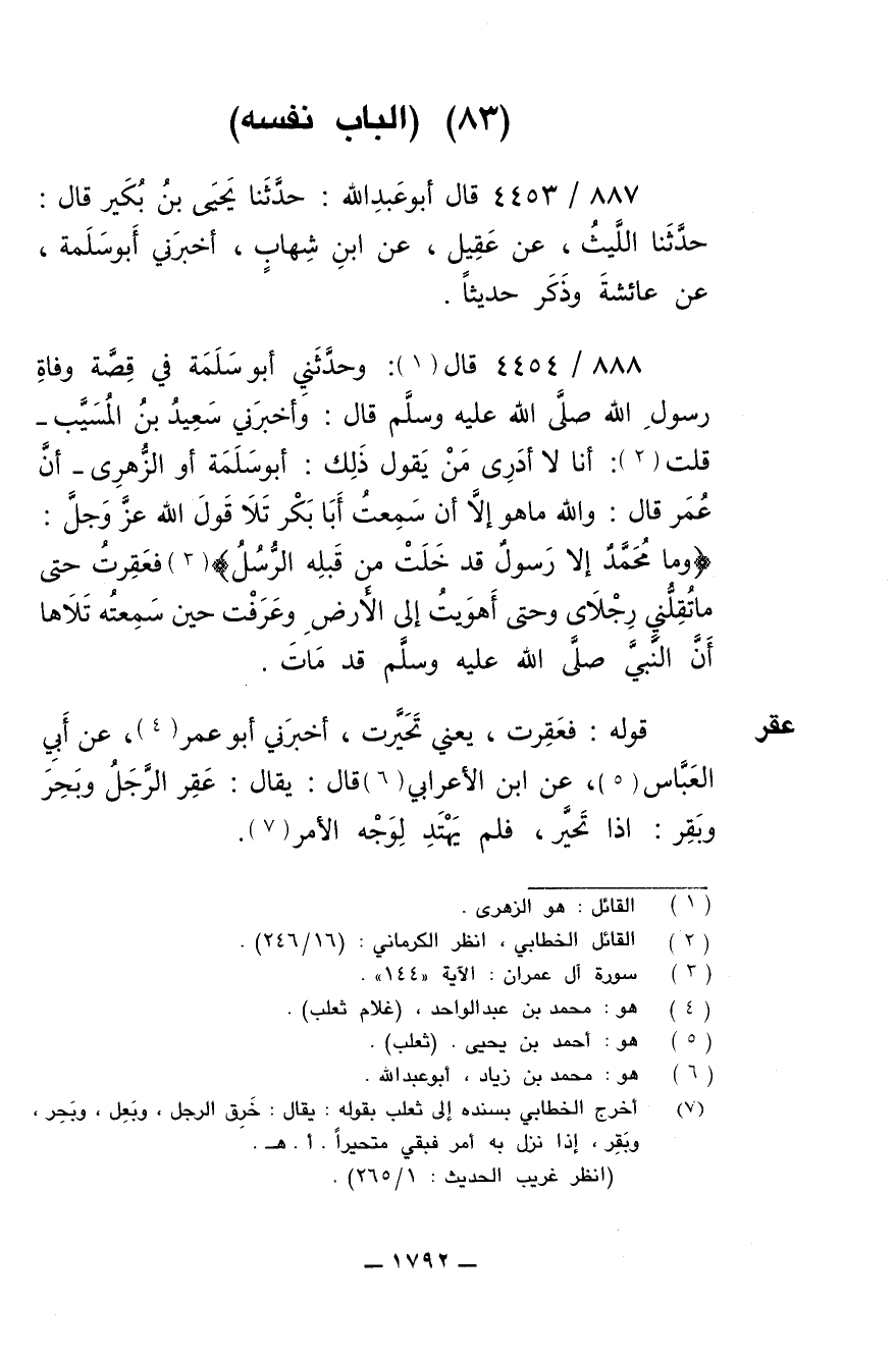888/ 4454 - قَالَ: وَحَدَّثَنِي أَبُو سَلَمَةَ في قصة وفاة رسول الله صلى الله عليه وسلم قال: وأخبرني سعيد بن المسيب قلت: أنا لا أدرى من يقول ذلك: أبو سلمة أو الزهري أن عُمَرَ قَالَ: وَاللَّهِ مَا هُوَ إِلاَّ أَنْ سَمِعْتُ أَبَا بَكْرٍ تَلاَ قول الله عزوجل: (وَمَا مُحَمَّدٌ إِلاَّ رَسُولٌ قَدْ خَلَتْ مِنْ قَبْلِهِ الرُّسُلُ) فَعَقِرْتُ حَتَّى مَا تُقِلُّنِي رِجْلاَىَ، وَحَتَّى أَهْوَيْتُ إِلَى الأَرْضِ وعرفت حِينَ سَمِعْتُهُ تَلاَهَا أَنَّ النَّبِيَّ صلى الله عليه وسلم قَدْ مَاتَ.