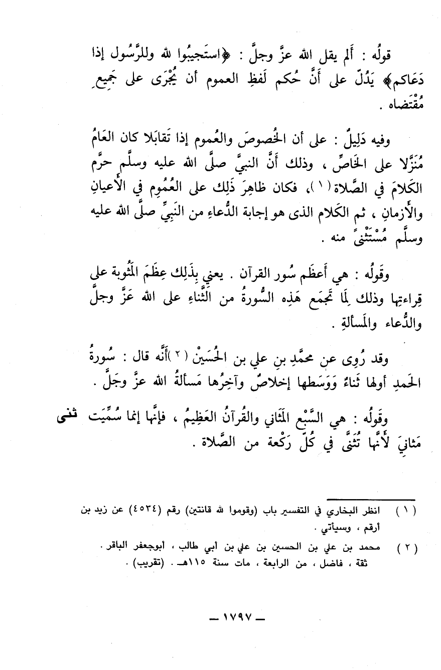 وفيه دليل: على أن الخصوص والعموم إذا تقابلا كان العام منزلا على الخاص، وذلك أن النبي صلى الله عليه وسلم حرم الكلام في الصلاة فكان ظاهر ذلك على العموم في الأعيان والأزمان، ثم الكلام الذي هو إجابة الدعاء من النبي صلى الله عليه وسلم مستثنى منه.
