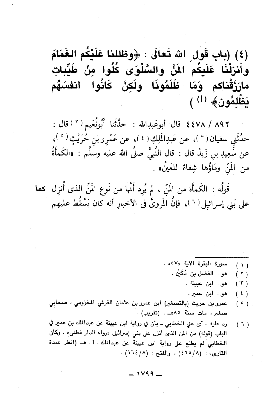 892/ 4478 - قال أبو عَبدِالله: حَدَّثَنَا أَبُو نُعَيْمٍ قال: حَدَّثَني سُفْيَانُ عَنْ عَبْدِ الْمَلِكِ عَنْ عَمْرِو بْنِ حُرَيْثٍ عَنْ سَعِيدِ بْنِ زَيْدٍ - رضى الله عنه - قَالَ: قَالَ النبي صلى الله عليه وسلم: «الْكَمْأَةُ مِنَ الْمَنِّ، وَمَاؤُهَا شِفَاءٌ لِلْعَيْنِ».