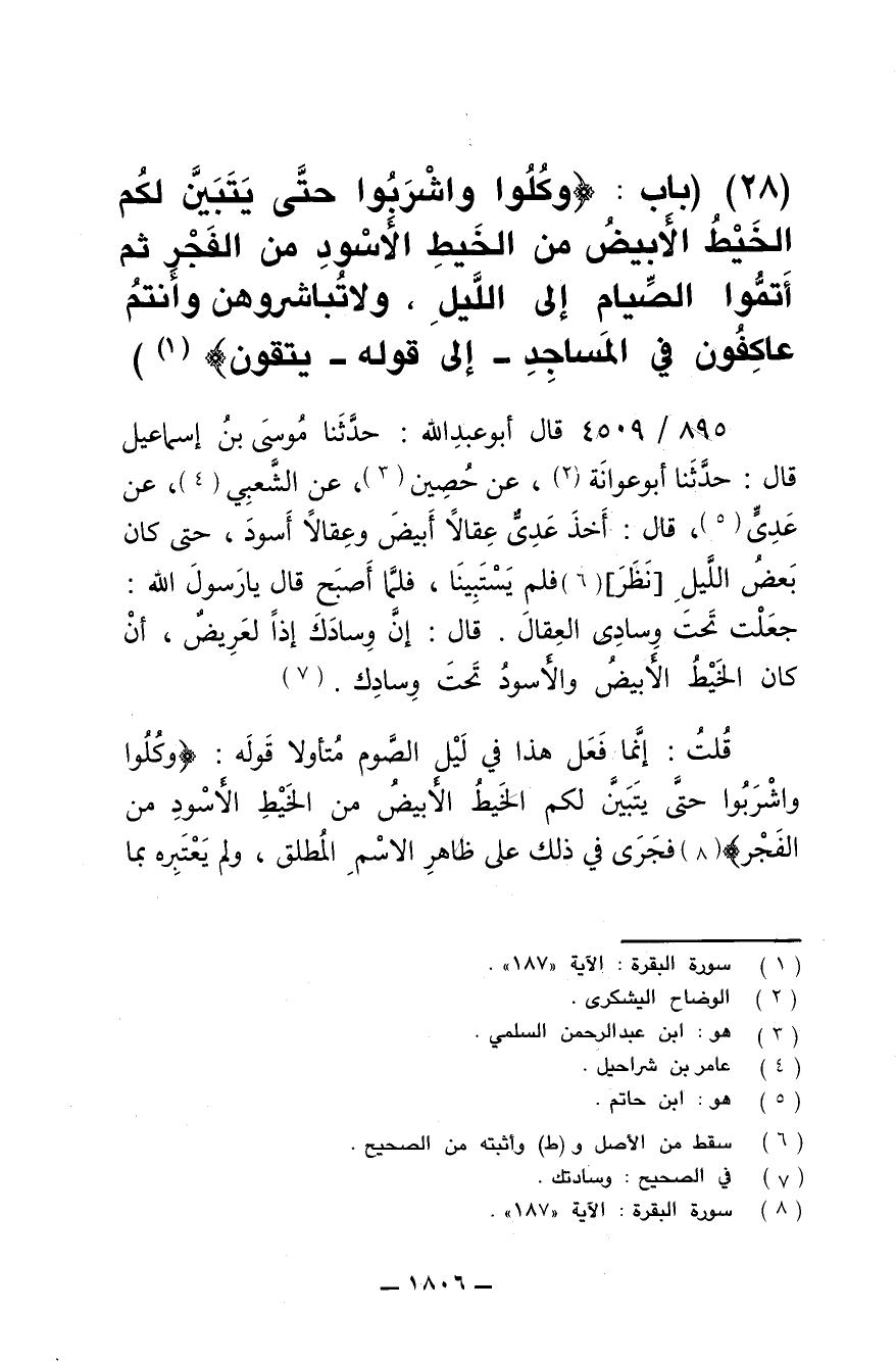 (28) (باب: {وكلوا واشربوا حتى يتبين لكم الخيط الأبيض من الخيط الأسود من الفجر ثم أتموا الصيام إلى الليل ولا تباشروهن وأنتم عاكفون في المساجد -إلى قوله- يتقون})