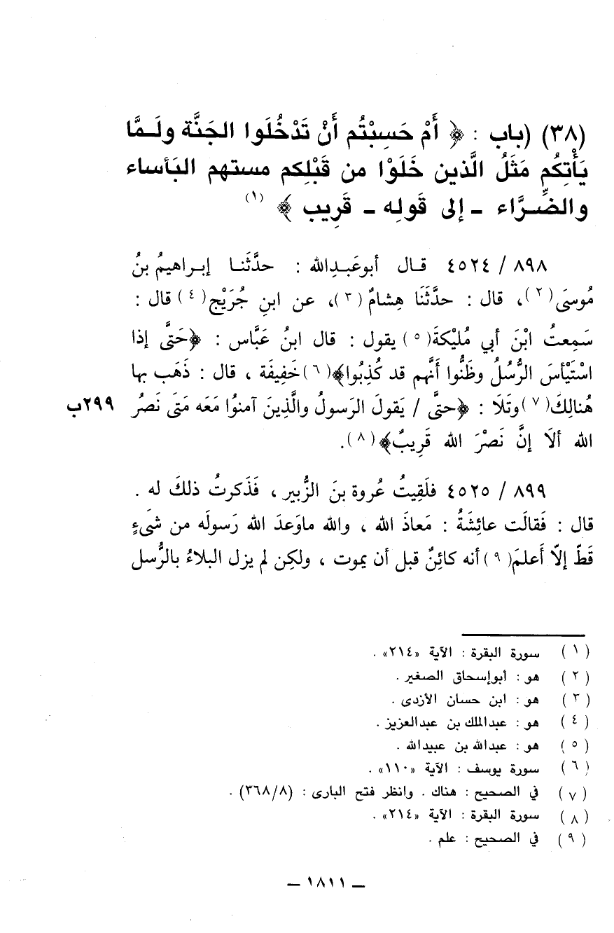 898/ 4524 - قال أبو عبدالله: حَدَّثَنَا إِبْرَاهِيمُ بْنُ مُوسَى قال: حدثَنَا هِشَامٌ عَنِ ابْنِ جُرَيْجٍ قَالَ: سَمِعْتُ ابْنَ أَبِي مُلَيْكَةَ يَقُولُ: قَالَ ابْنُ عَبَّاسٍ - رضى الله عنهما -: (حَتَّى إِذَا اسْتَيْأَسَ الرُّسُلُ وَظَنُّوا أَنَّهُمْ قَدْ كُذِبُوا) خَفِيفَةً، قال: ذَهَبَ بِهَا هُنَالكَ، وَتَلاَ: (حَتَّى / يَقُولَ الرَّسُولُ وَالَّذِين آمَنُوا مَعَهُ مَتَى نَصْرُ اللَّهِ أَلاَ إِنَّ نَصْرَ اللَّهِ قَرِيبٌ).